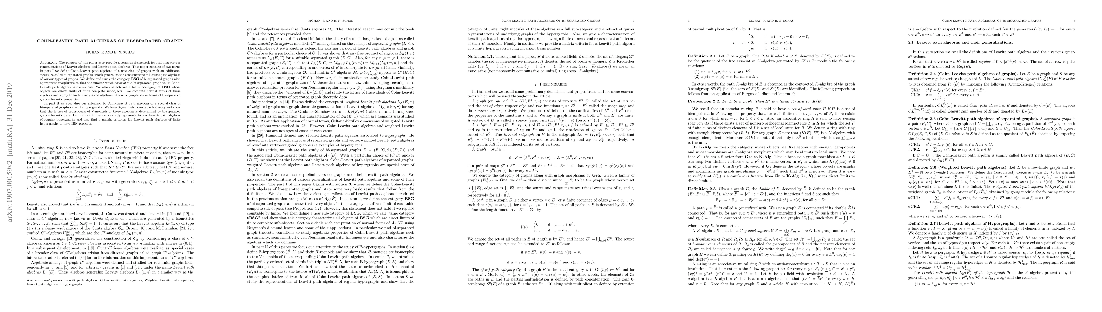 The introduction of Cohn-Leavitt path algebras for bi-separated graphs and the development of a category \(\textbf{BSG}\) with continuous functor properties.