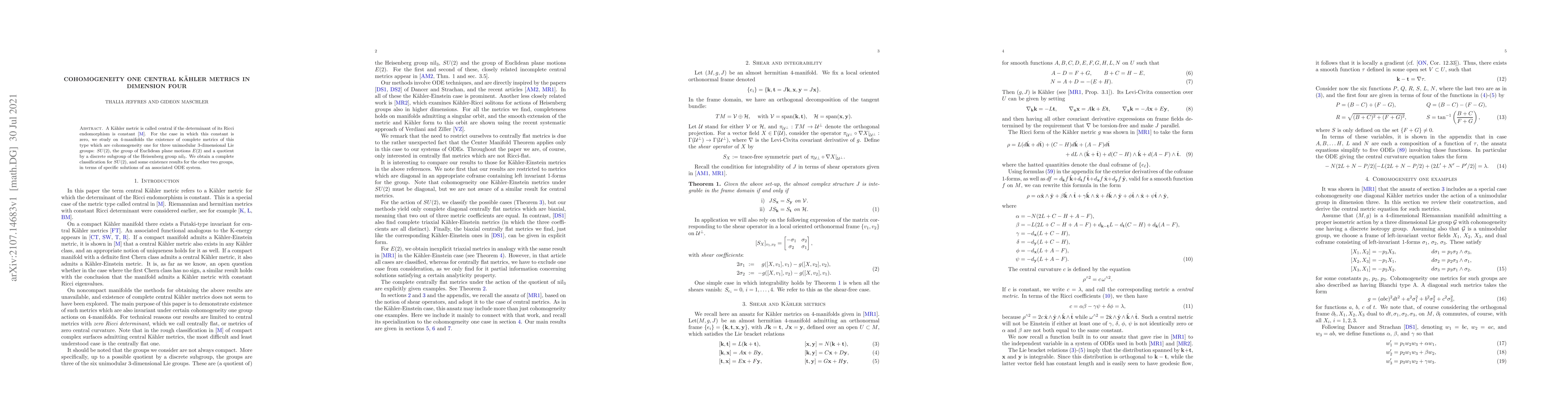 The paper classifies cohomogeneity one central Kähler metrics in dimension four for $SU(2)$, while presenting existence results for $E(2)$ and $\mathrm{nil}_3$, solving an associated ODE system to characterize these metrics.