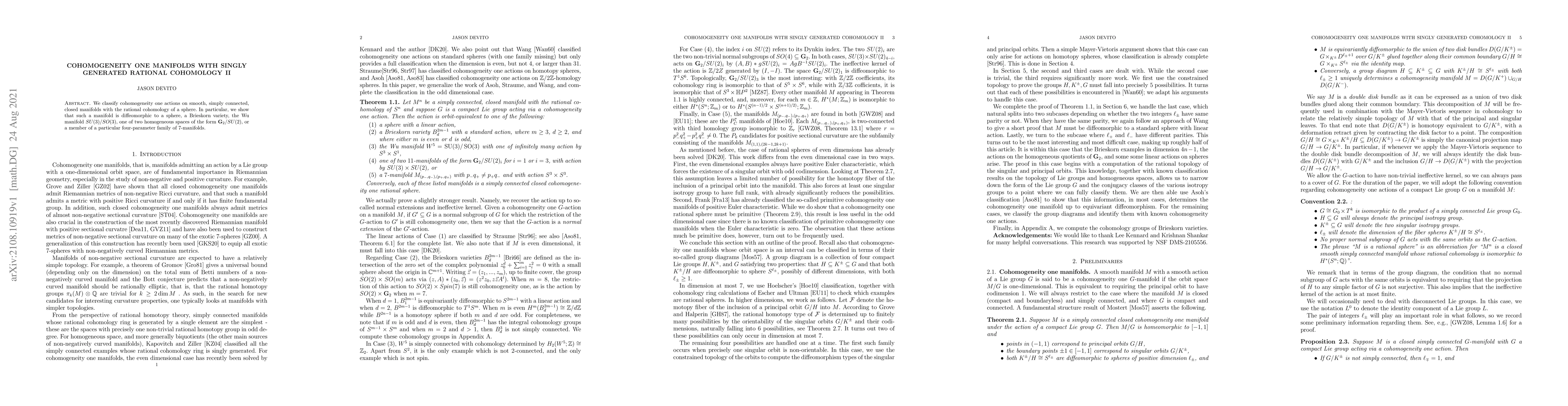 This paper classifies cohomogeneity one actions on smooth, simply connected, closed manifolds with sphere-like rational cohomology, showing they are diffeomorphic to a sphere, a Brieskorn variety, the Wu manifold, one of two $\mathbf{G}_2/SU(2)$ homogeneous spaces, or a four-parameter family of $7$-manifolds.
