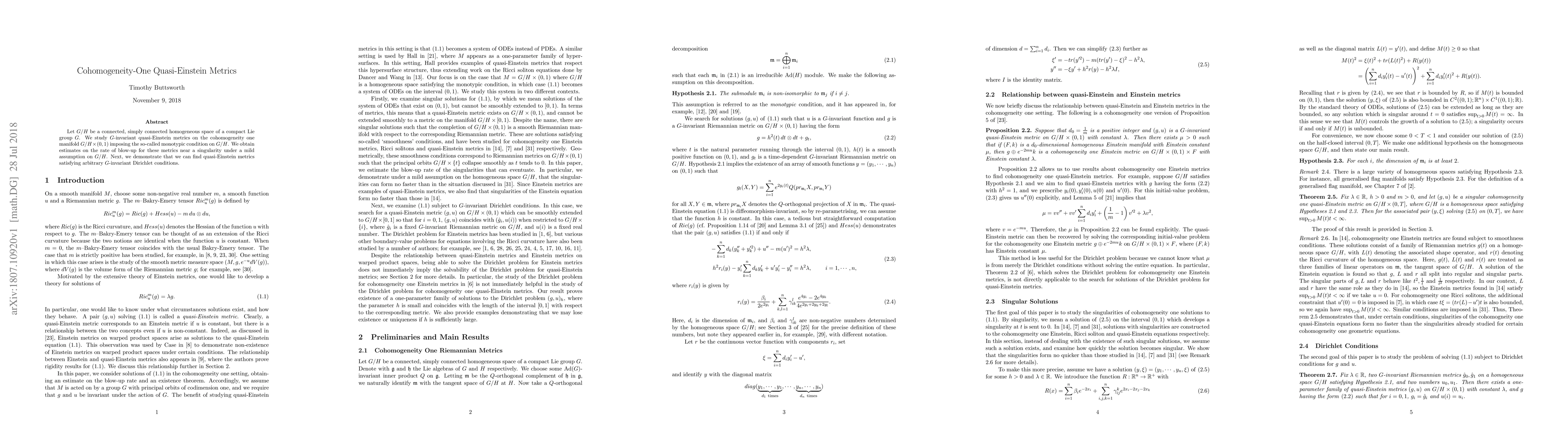 This paper investigates $G$-invariant quasi-Einstein metrics on cohomogeneity-one manifolds $G/H \times (0,1)$ under the monotypic condition, providing estimates on their blow-up rates near singularities and showing the existence of such metrics meeting specified $G$-invariant Dirichlet conditions.
