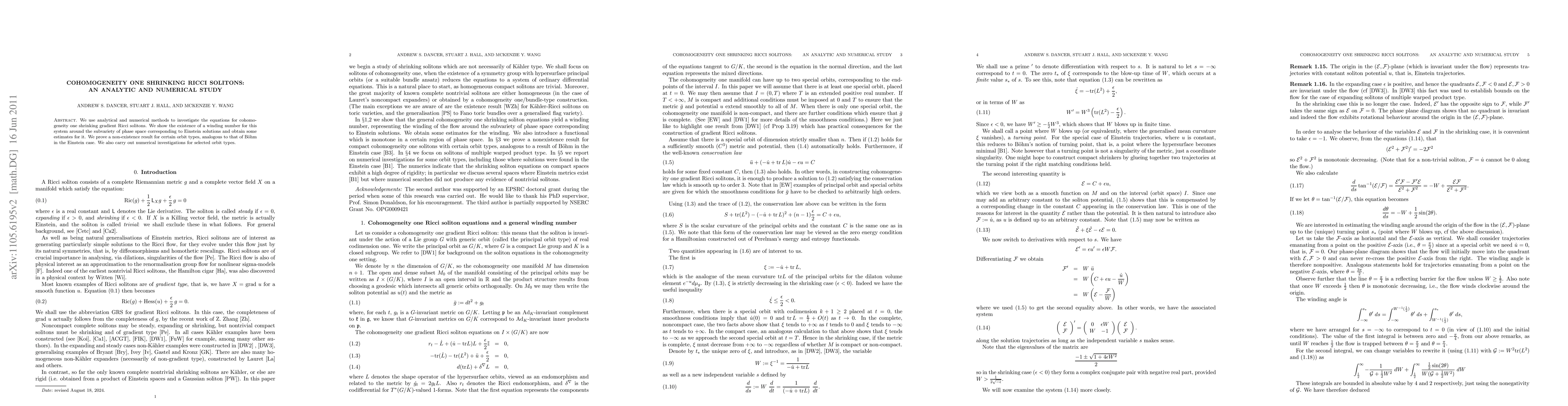 This paper combines analytical and numerical methods to study cohomogeneity one shrinking gradient Ricci solitons, proving the existence of a winding number around Einstein solutions and establishing non-existence results for specific orbit types, alongside numerical investigations.