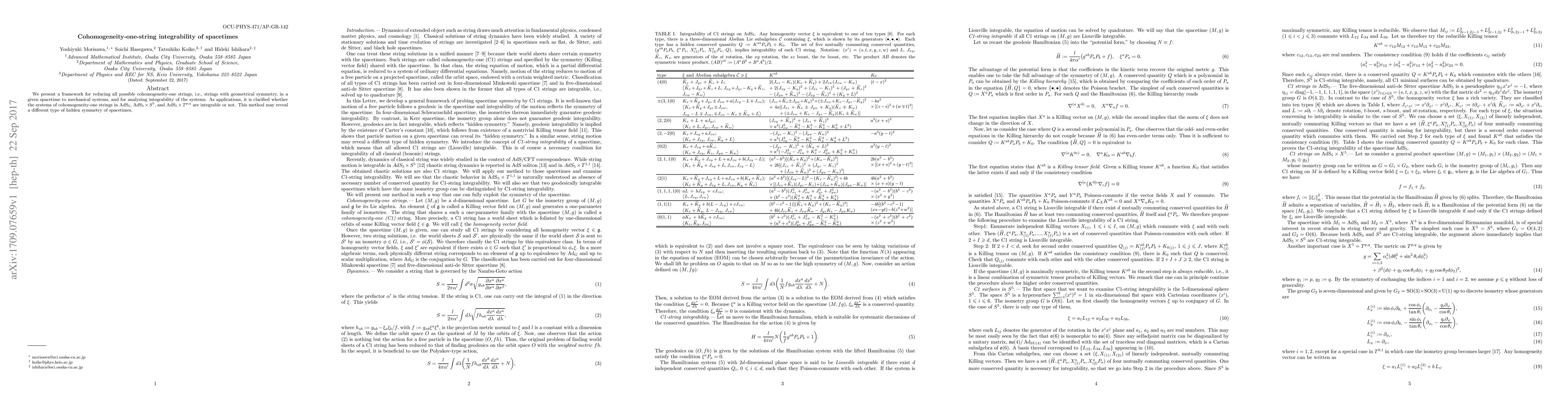 We present a framework for reducing all possible cohomogeneity-one strings, i.e., strings with geometrical symmetry, in a given spacetime to mechanical systems, and for analyzing integrability of the systems. As applications, it is clarified whether the systems of cohomogeneity-one strings in $AdS_5$, $AdS_5 \times S^5$, and $AdS_5 \times T^{p,q}$ are integrable or not. This method may reveal a different type of hidden symmetry of spacetimes.