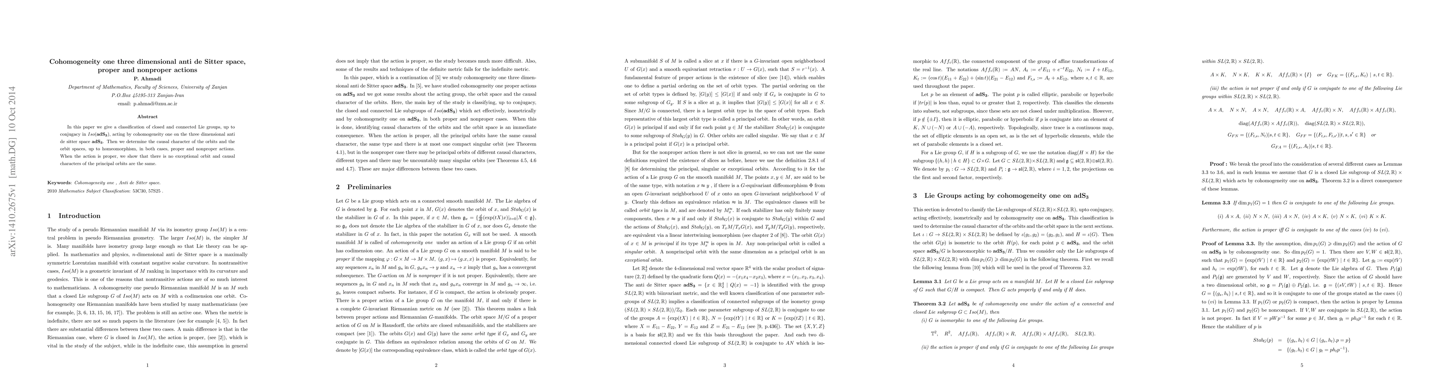 This paper classifies closed, connected Lie groups acting on three-dimensional anti-de Sitter space by cohomogeneity one, determining the causal characters of orbits and orbit spaces for both proper and nonproper actions, showing no exceptional orbits and identical causal characters for principal orbits in proper actions.