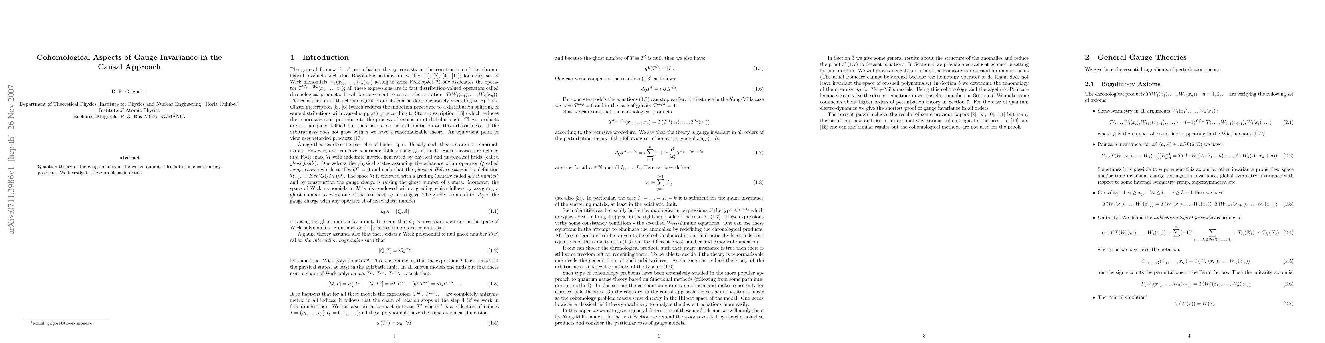 Quantum theory of the gauge models in the causal approach leads to some cohomology problems. We investigate these problems in detail.