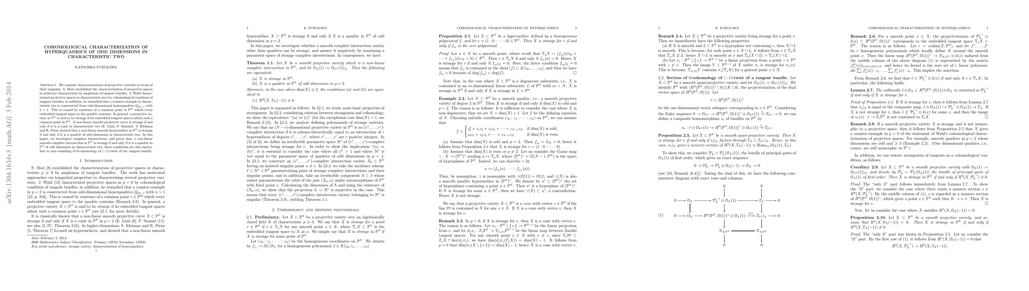This paper investigates the cohomological characterization of projective varieties, specifically focusing on hyperquadrics of odd dimensions in characteristic two. It proves that a non-linear smooth complete intersection variety is "strange" if and only if it is an odd-dimensional hyperquadric in characteristic two, which is linked to the non-vanishing of the 0-cohomology of the (-1)-twist of the tangent bundle.