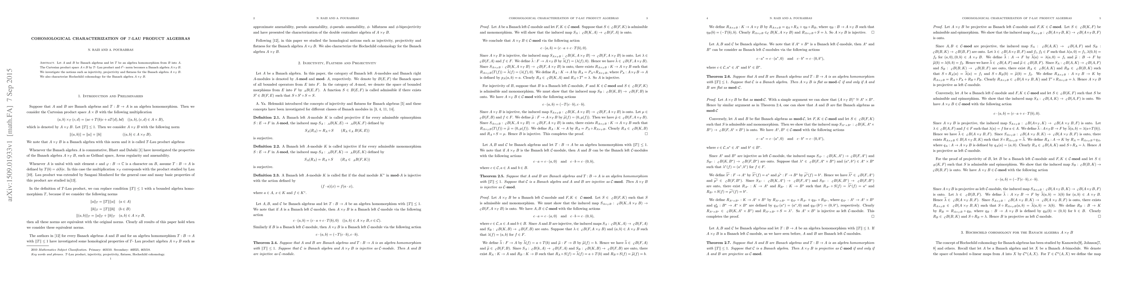 Let $A$ and $B$ be Banach algebras and let $T$ be an algebra homomorphism from $B$ into $A$. The Cartesian product space $A\times B$ by $T$- Lau product and $\ell^{1}$- norm becomes a Banach algebra $A\times_{T}B$. We investigate the notions such as injectivity, projectivity and flatness for the Banach algebra $A\times_{T}B$. We also characterize Hochschild cohomology for the Banach algebra $A\times_{T}B$.