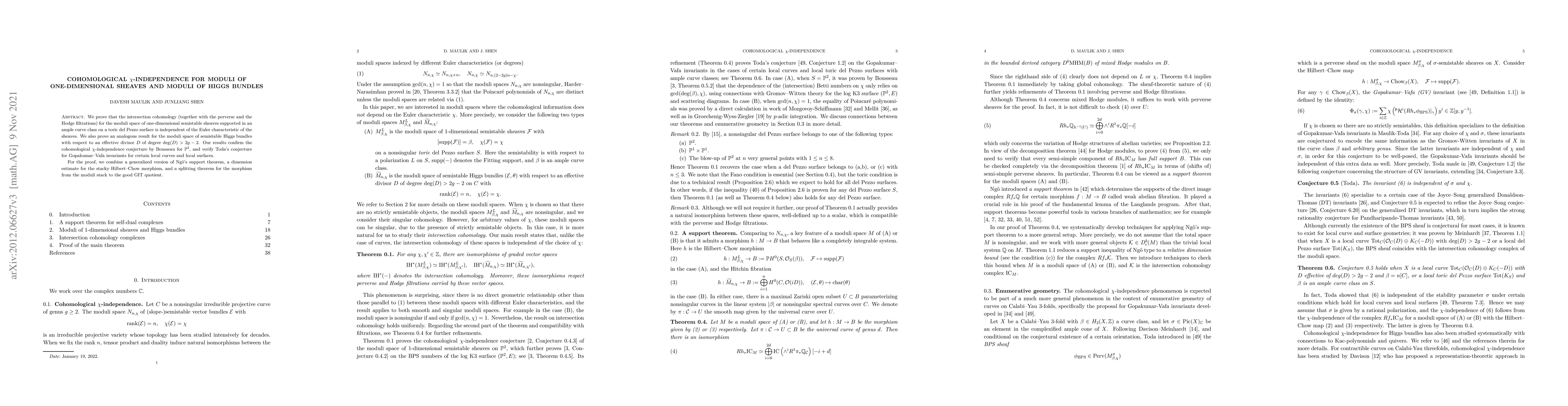 This paper proves cohomological $\chi$-independence for moduli spaces of one-dimensional sheaves on toric del Pezzo surfaces and for semistable Higgs bundles, confirming Bousseau's conjecture for $\mathbb{P}^2$ and verifying Toda's conjecture for Gopakumar-Vafa invariants. The proof utilizes Ngô's support theorem, dimension estimates, and a splitting theorem.