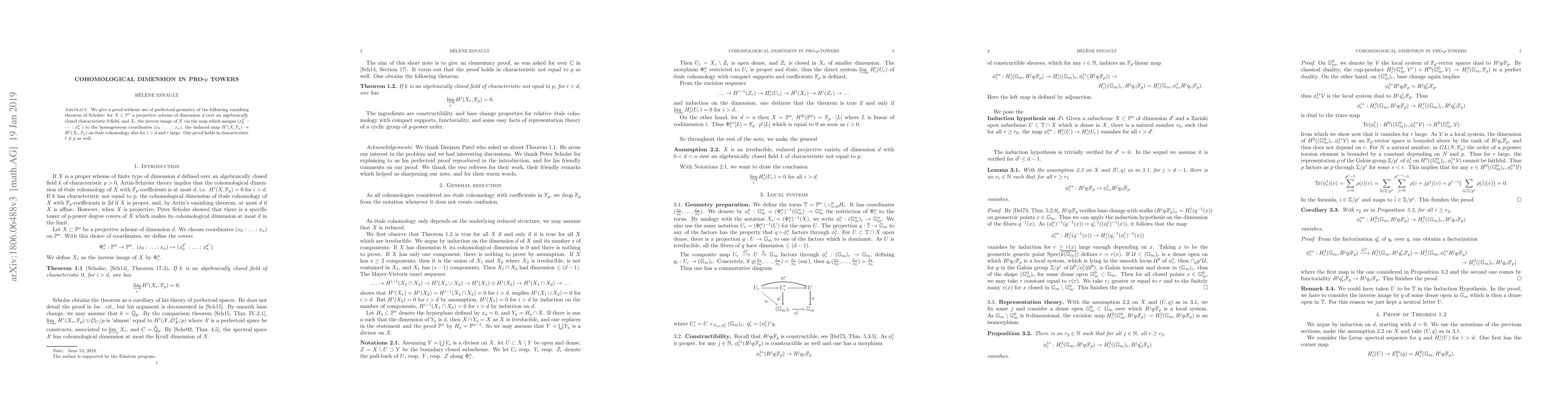 We give a proof without use of perfectoid geometry of Scholzes' vanishing theorem of \'etale cohomology with $\mathbb{F}_p$-coefficients beyond the dimension of projective varieties in a specific pro $p$-tower in characteristic not equal to $p$. Final version.