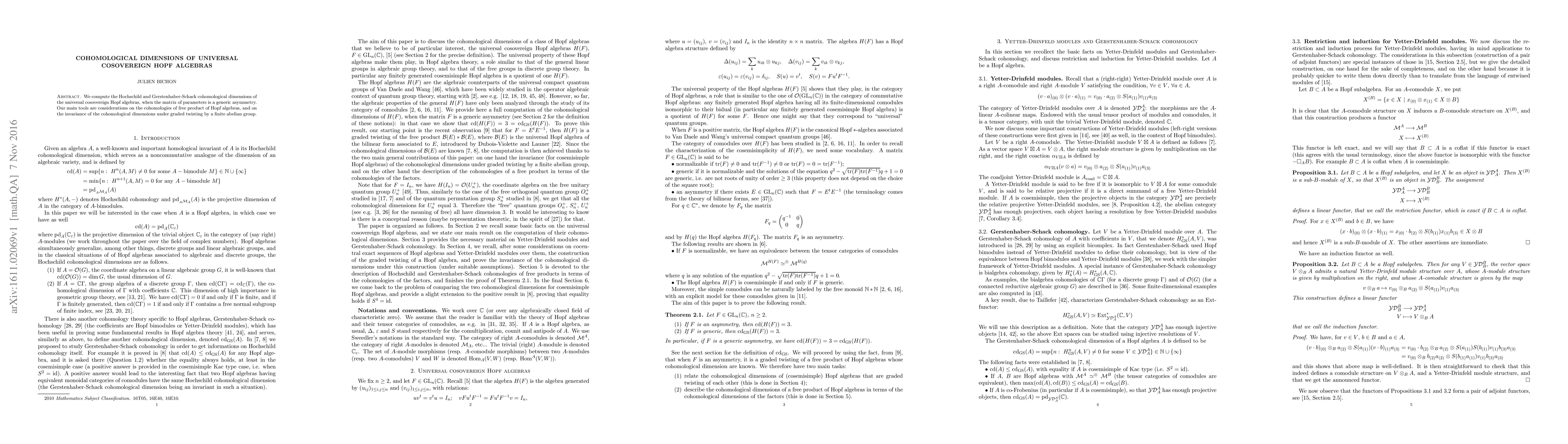 We compute the Hochschild and Gerstenhaber-Schack cohomological dimensions of the universal cosovereign Hopf algebras, when the matrix of parameters is a generic asymmetry. Our main tools are considerations on the cohomologies of free product of Hopf algebras, and on the invariance of the cohomological dimensions under graded twisting by a finite abelian group.