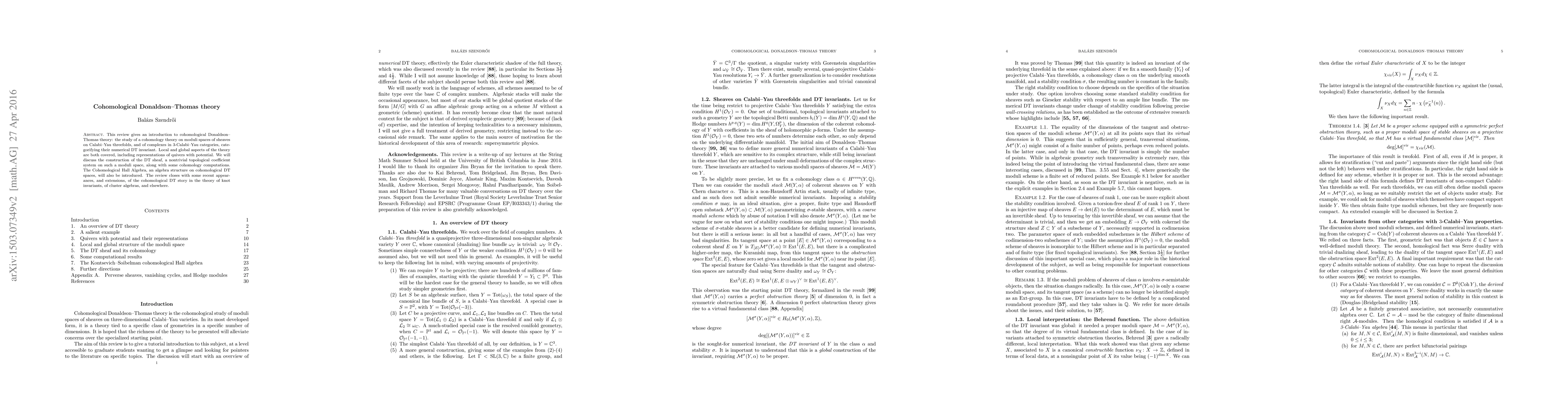 This review gives an introduction to cohomological Donaldson-Thomas theory: the study of a cohomology theory on moduli spaces of sheaves on Calabi-Yau threefolds, and of complexes in 3-Calabi-Yau categories, categorifying their numerical DT invariant. Local and global aspects of the theory are both covered, including representations of quivers with potential. We will discuss the construction of the DT sheaf, a nontrivial topological coefficient system on such a moduli space, along with some cohomology computations. The Cohomological Hall Algebra, an algebra structure on cohomological DT spaces, will also be introduced. The review closes with some recent appearances, and extensions, of the cohomological DT story in the theory of knot invariants, of cluster algebras, and elsewhere.