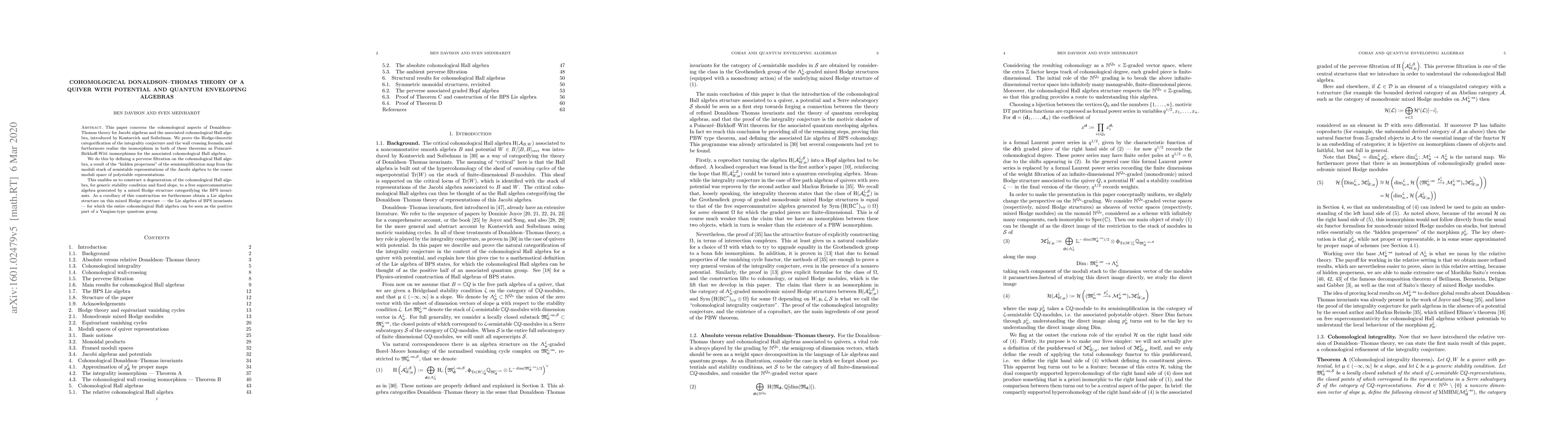 This paper explores cohomological aspects of Donaldson-Thomas theory for Jacobi algebras, proving the Hodge-theoretic categorification of the integrality conjecture and realizing the isomorphism as a Poincaré-Birkhoff-Witt isomorphism. It constructs a degeneration of the cohomological Hall algebra to a free supercommutative algebra, revealing a Lie algebra structure for BPS invariants and identifying the Hall algebra as the positive part of a quantum group.