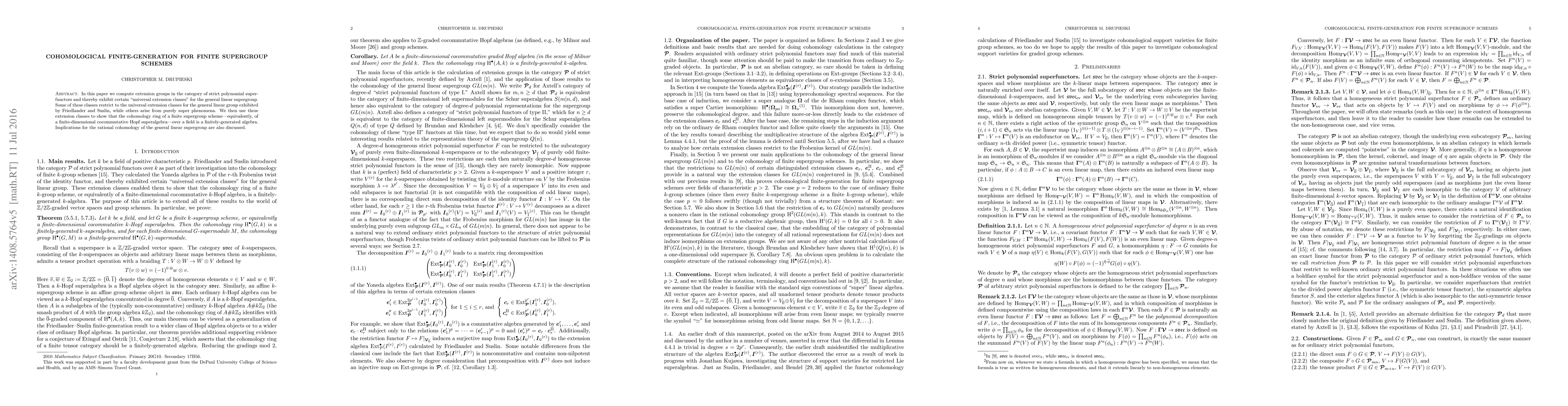 This paper computes extension groups in strict polynomial superfunctors to uncover universal extension classes for the general linear supergroup, showing that the cohomology ring of a finite supergroup scheme is finitely generated, with implications for the rational cohomology of the general linear supergroup.