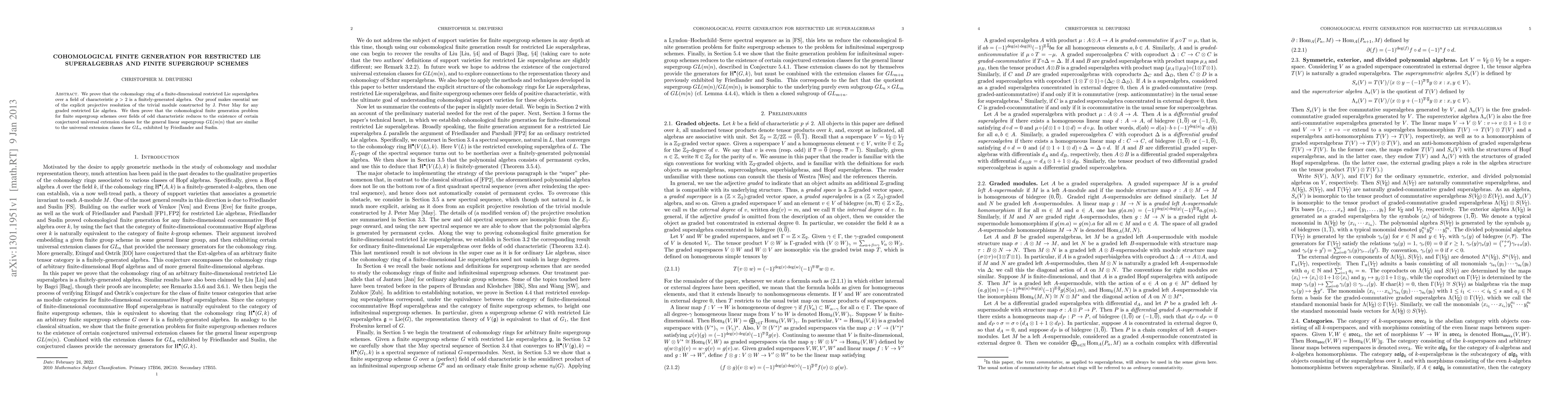 The paper demonstrates that the cohomology ring of finite-dimensional restricted Lie superalgebras over fields of characteristic $p > 2$ is finitely generated, using May's projective resolution. It also shows that cohomological finite generation for finite supergroup schemes over odd characteristic fields depends on the existence of certain conjectured universal extension classes for $GL(m|n)$.
