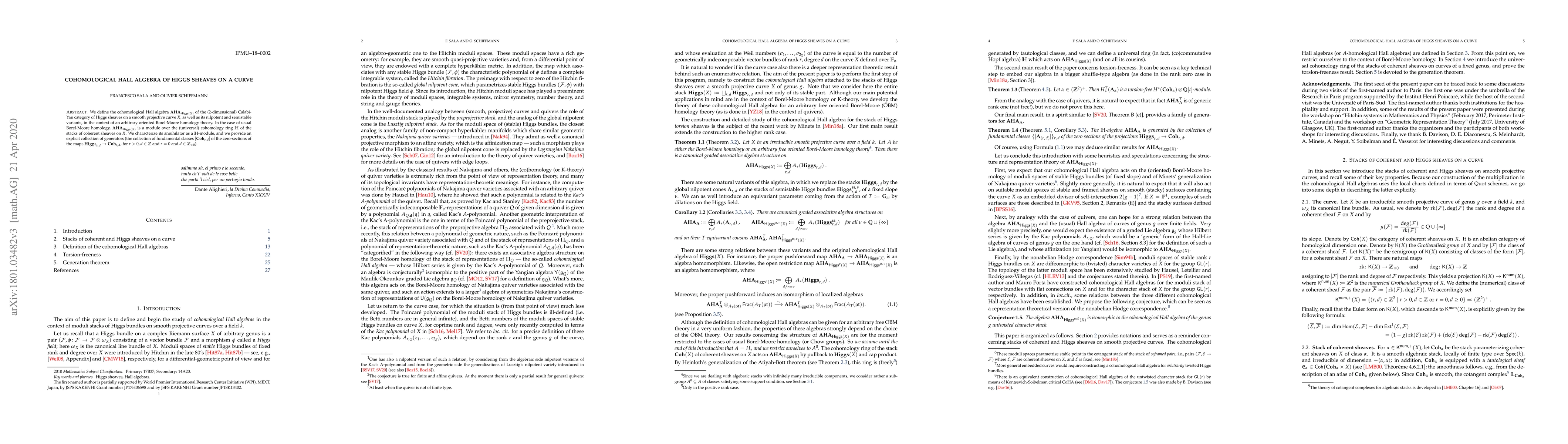 We define the cohomological Hall algebra ${AHA}_{Higgs(X)}$ of the ($2$-dimensional) Calabi-Yau category of Higgs sheaves on a smooth projective curve $X$, as well as its nilpotent and semistable variants, in the context of an arbitrary oriented Borel-Moore homology theory. In the case of usual Borel-Moore homology, ${AHA}_{Higgs(X)}$ is a module over the (universal) cohomology ring $\mathbb{H}$ of the stacks of coherent sheaves on $X$ . We show that it is a torsion-free $\mathbb{H}$-module, and we provide an explicit collection of generators (the collection of fundamental classes $[Coh_{r,d}]$ of the zero-sections of the map $Higgs_{r,d} \to Coh_{r,d}$, for $r \geq 0, d \in Z$).
