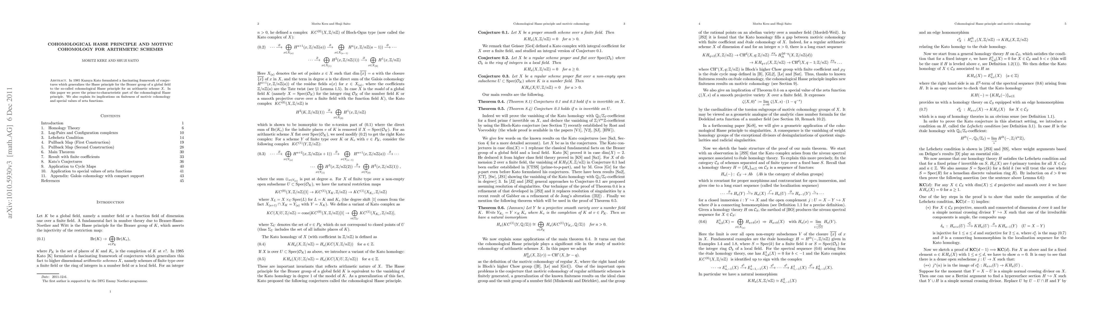 This paper proves the prime-to-characteristic part of Kazuya Kato's cohomological Hasse principle for arithmetic schemes, and discusses its implications for the finiteness of motivic cohomology and special values of zeta functions.