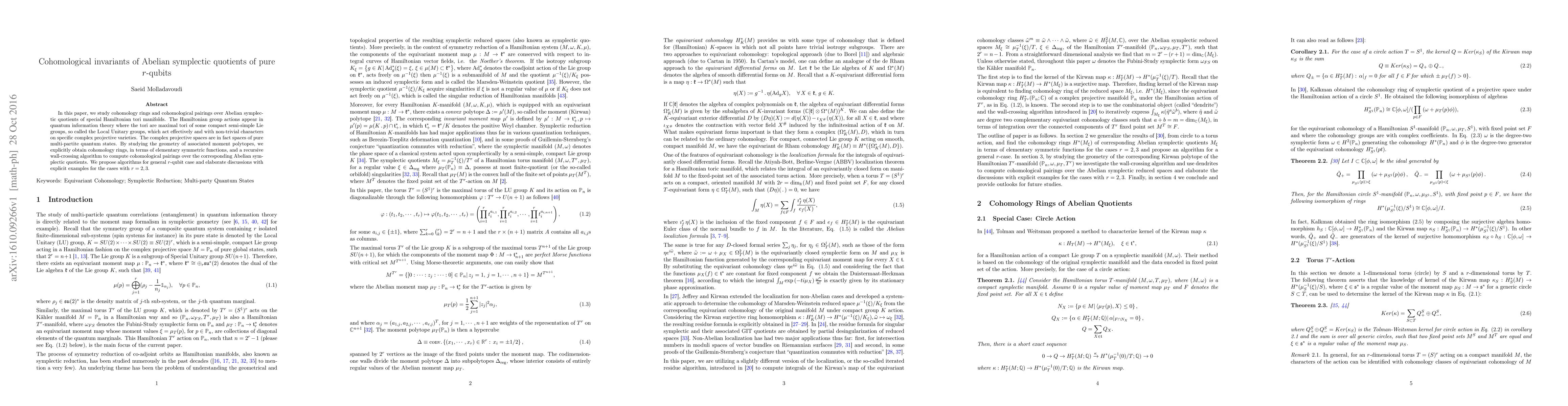 This paper investigates cohomology rings and pairings over Abelian symplectic quotients of special Hamiltonian tori in quantum information theory. It develops recursive algorithms to compute these cohomological structures, focusing on pure multi-qubit states, and provides explicit examples for $r=2$ and $r=3$.