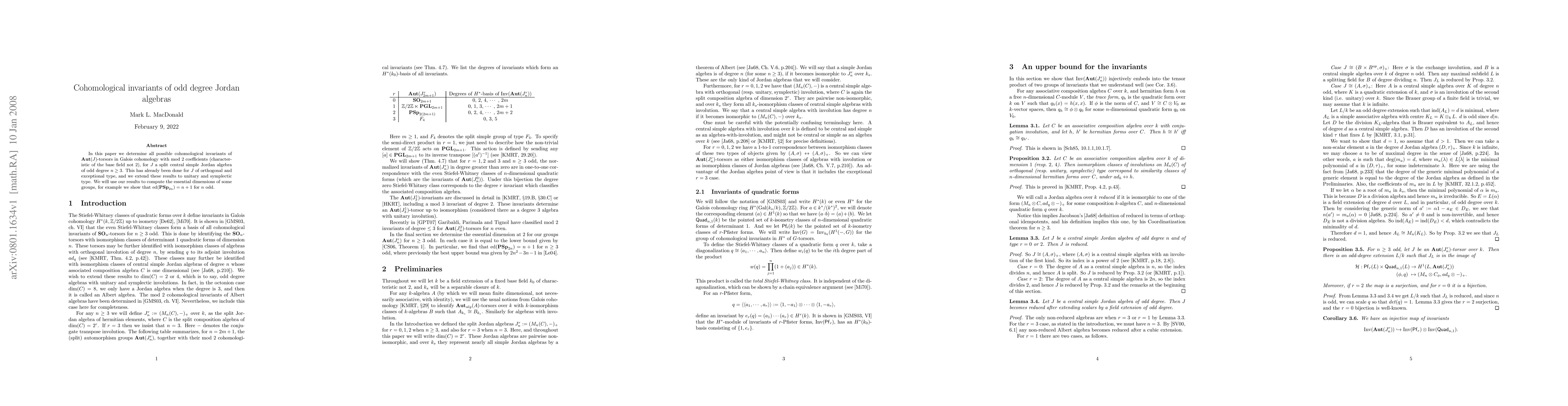 In this paper we determine all possible cohomological invariants of Aut(J)-torsors in Galois cohomology with mod 2 coefficients (characteristic of the base field not 2), for J a split central simple Jordan algebra of odd degree n>=3. This has already been done for J of orthogonal and exceptional type, and we extend these results to unitary and symplectic type. We will use our results to compute the essential dimensions of some groups, for example we show that ed(PSp(2n))=n+1 for n odd.