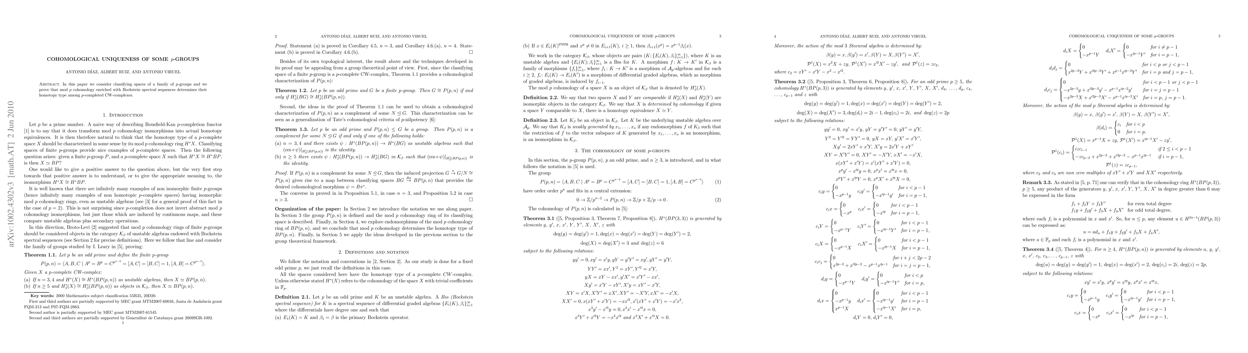 In this paper we consider classifying spaces of a family of $p$-groups and we prove that mod $p$ cohomology enriched with Bockstein spectral sequences determines their homotopy type among $p$-completed CW-complexes. We end with some applications to group theory.