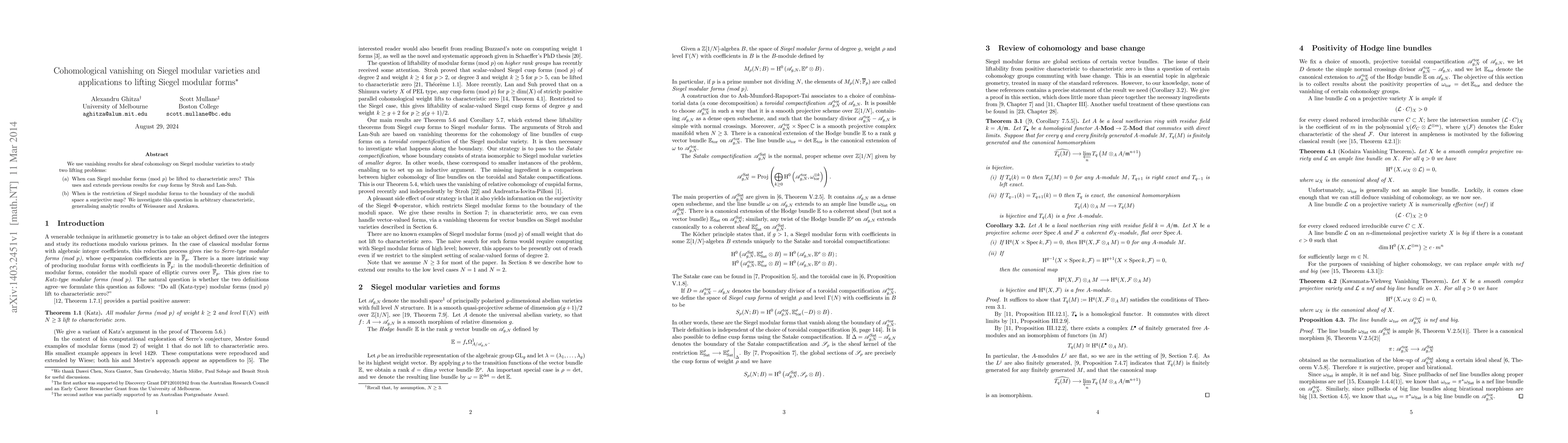 Summary: This paper utilizes cohomological vanishing on Siegel modular varieties to address lifting problems of Siegel modular forms, extending prior work to determine when such forms can be lifted from mod p to characteristic zero and whether their restrictions to boundary components are surjective.