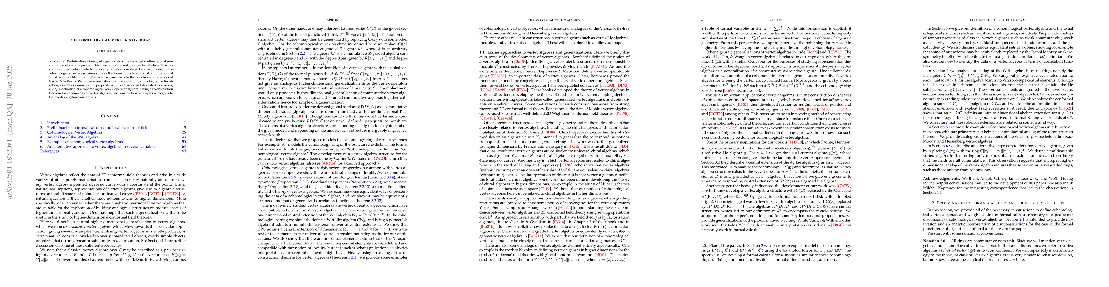 The development of cohomological vertex algebras and their associated structural theorems, Witt-like algebra examination, and reconstruction theorem.