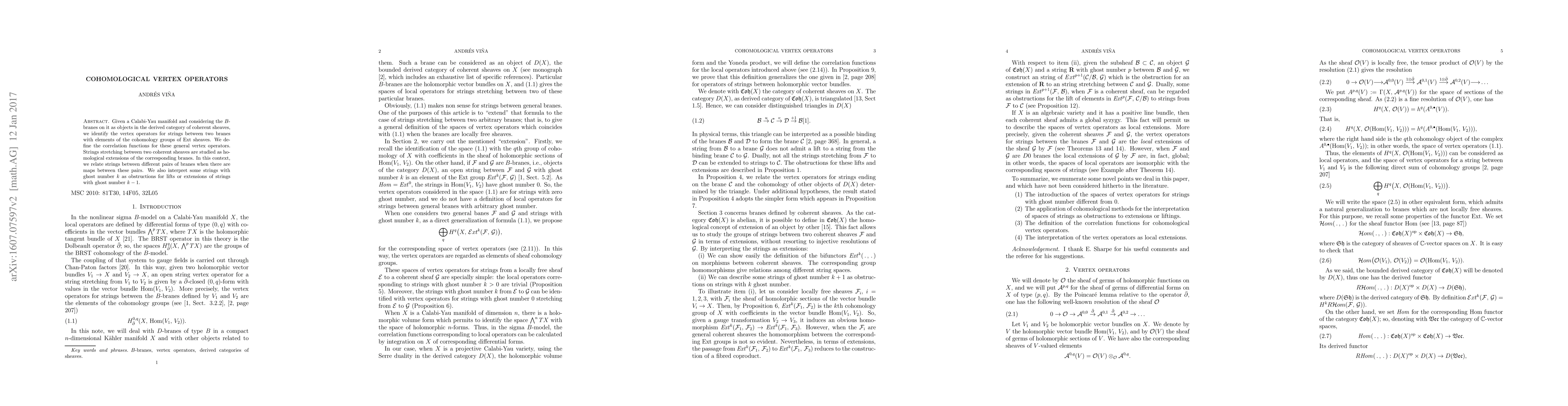This research paper introduces a method to calculate vertex operators for strings between Calabi-Yau manifolds' branes using cohomology groups of Ext sheaves, with implications for understanding string theory.