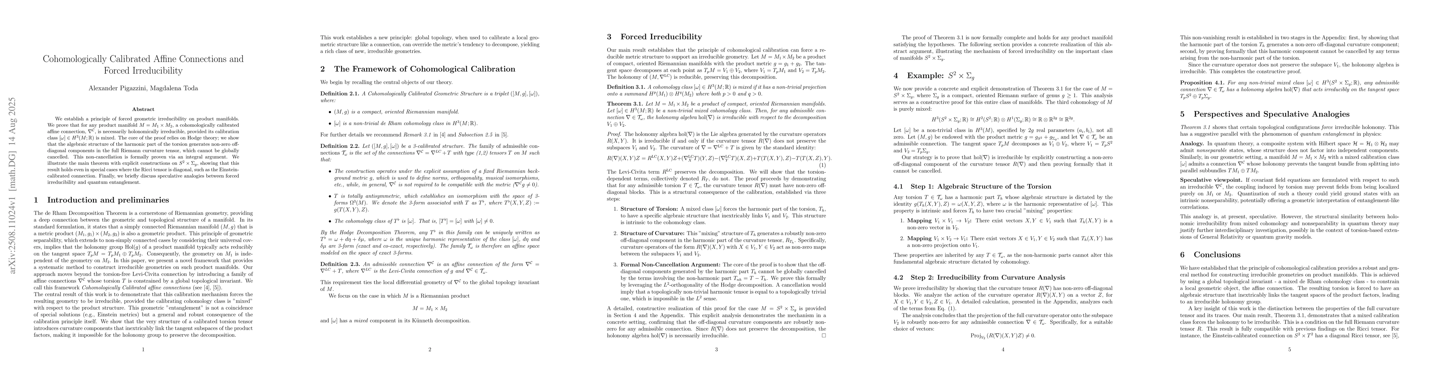 We establish a principle of forced geometric irreducibility on product manifolds. We prove that for any product manifold $M=M_1\times M_2$, a cohomologically calibrated affine connection, $\nabla^{\mathcal{C}}$, is necessarily holonomically irreducible, provided its calibration class $[\omega] \in H^3(M;\mathbb{R})$ is mixed. The core of the proof relies on Hodge theory; we show that the algebraic structure of the harmonic part of the torsion generates non-zero off-diagonal components in the full Riemann curvature tensor, which cannot be globally cancelled. This non-cancellation is formally proven via an integral argument. We illustrate the main theorem with explicit constructions on $S^2\times \Sigma_g$, showing that this result holds even in special cases where the Ricci tensor is diagonal, such as the Einstein-calibrated connection. Finally, we briefly discuss speculative analogies between forced irreducibility and quantum entanglement.