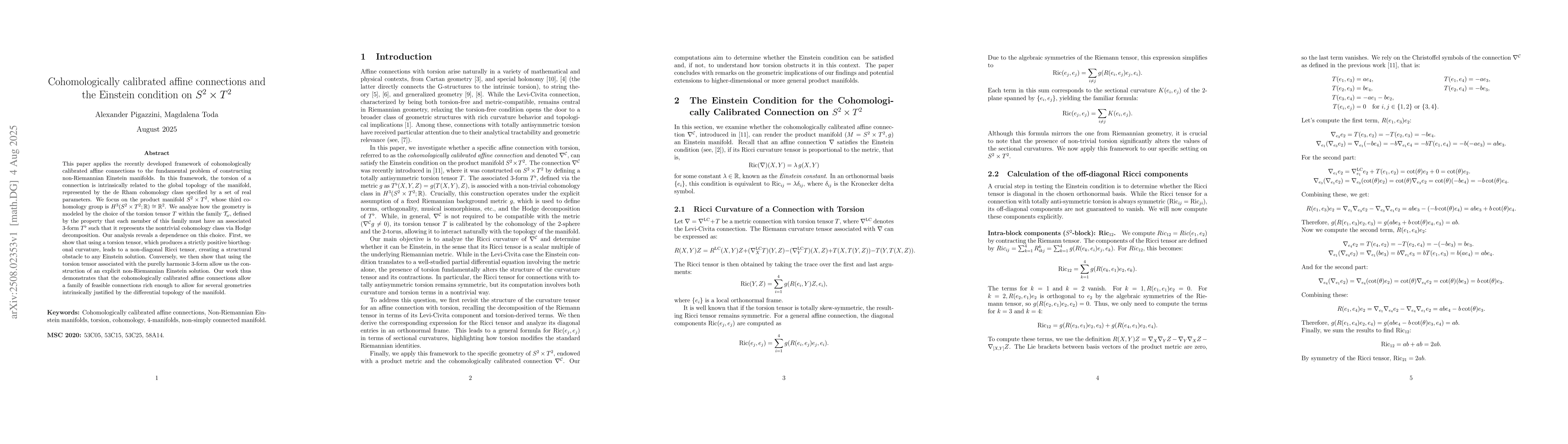 This paper applies the recently developed framework of cohomologically calibrated affine connections to the fundamental problem of constructing non-Riemannian Einstein manifolds. In this framework, the torsion of a connection is intrinsically related to the global topology of the manifold, represented by the de Rham cohomology class specified by a set of real parameters. We focus on the product manifold $S^2 \times T^2$, whose third cohomology group is $H^3(S^2 \times T^2; \mathbb{R}) \cong \mathbb{R}^2$. We analyze how the geometry is modeled by the choice of the torsion tensor $T$ within the family $\mathcal{T}_\omega$, defined by the property that each member of this family must have an associated 3-form $T^\flat$ such that it represents the nontrivial cohomology class via Hodge decomposition. Our analysis reveals a dependence on this choice. First, we show that using a torsion tensor, which produces a strictly positive biorthogonal curvature, leads to a non-diagonal Ricci tensor, creating a structural obstacle to any Einstein solution. Conversely, we then show that using the torsion tensor associated with the purelly harmonic 3-form allow us the construction of an explicit non-Riemannian Einstein solution. Our work thus demonstrates that the cohomologically calibrated affine connections allow a family of feasible connections rich enough to allow for several geometries intrinsically justified by the differential topology of the manifold.