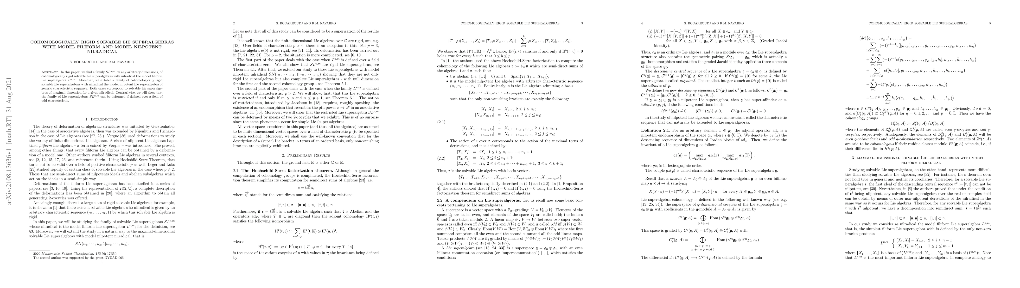 This paper identifies a family of cohomologically rigid solvable Lie superalgebras $SL^{n,m}$ characterized by specific nilradicals, namely model filiform and nilpotent Lie superalgebras. It concludes that these Lie superalgebras can be deformed if considered over fields of odd characteristic.