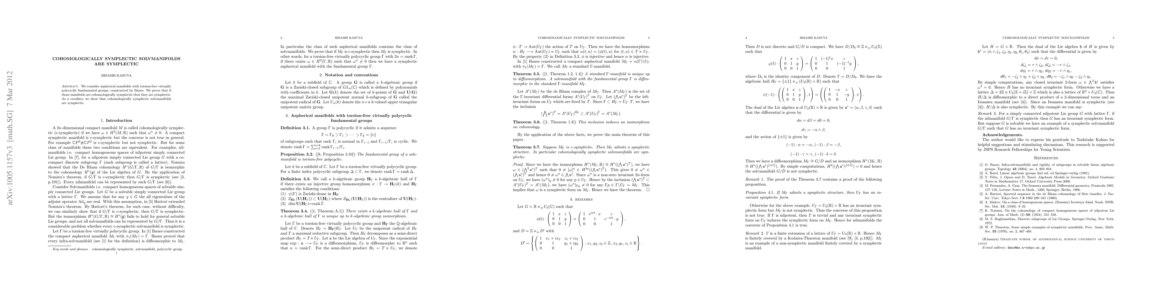 We consider aspherical manifolds with torsion-free virtually polycyclic fundamental groups, constructed by Baues. We prove that if those manifolds are cohomologically symplectic then they are symplectic. As a corollary we show that cohomologically symplectic solvmanifolds are symplectic.