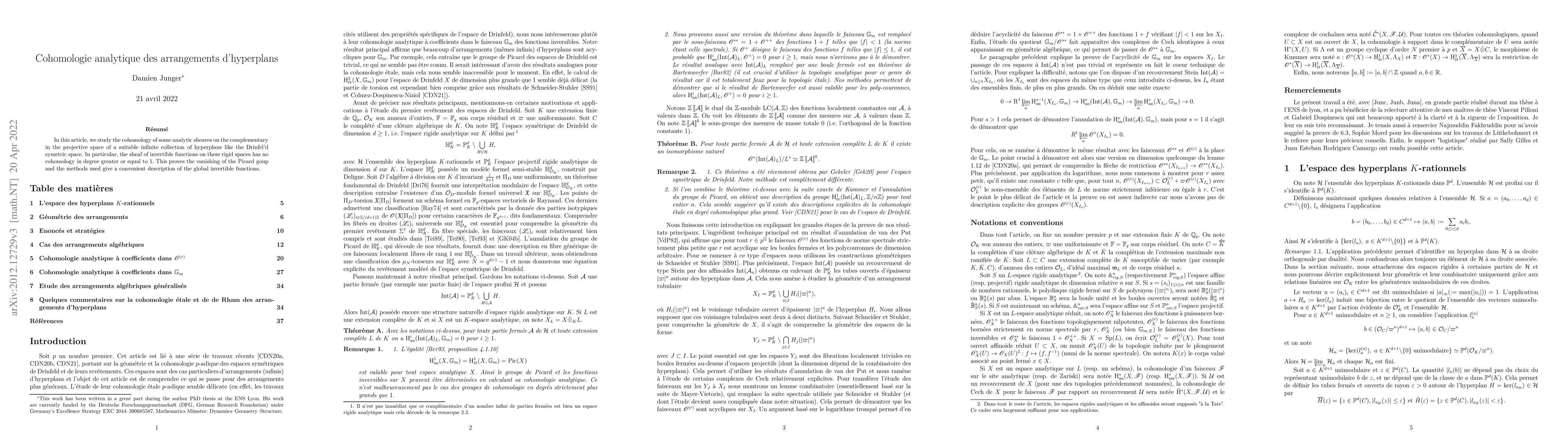 In this article, we study the cohomology of some analytic sheaves on the complementary in the projective space of a suitable infinite collection of hyperplane like the Drinfel'd symetric space. In particular, the sheaf of invertible functions on these rigid spaces has no cohomology in degree greater or equal to $1$. This proves the vanishing of the Picard goup and the methods used give a convenient description of the global invertible functions.