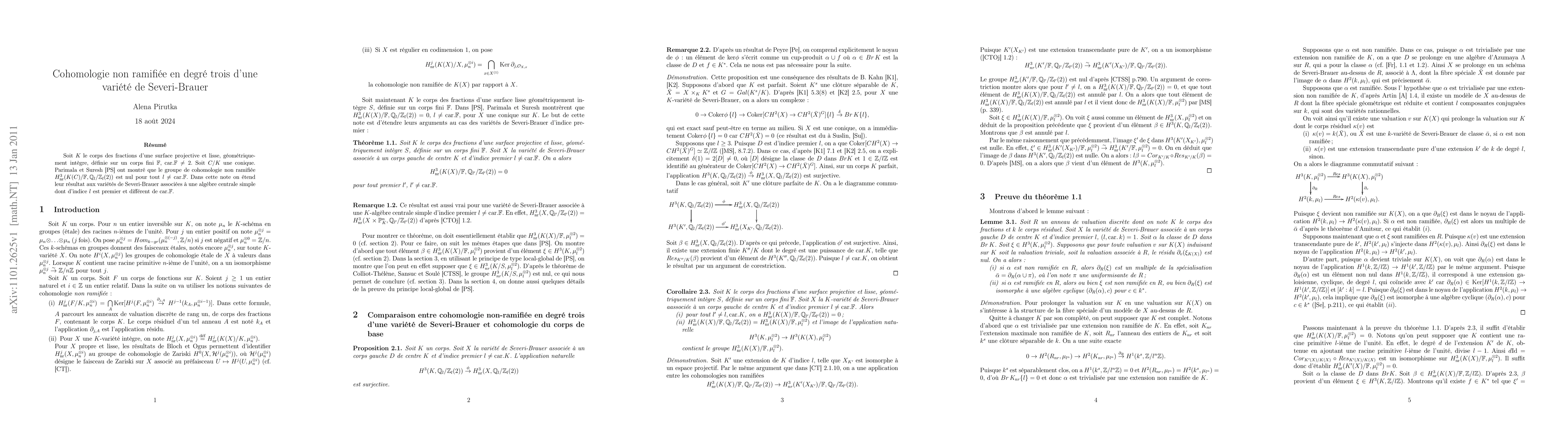Summary: Cette recherche étend les résultats de Parimala et Suresh sur la cohomologie non ramifiée en degré trois de champs de coniques à des variétés de Severi-Brauer associées à des algèbres centrales simples, en utilisant des indices premiers par rapport à la caractéristique du corps fini sur lequel elles sont définies.