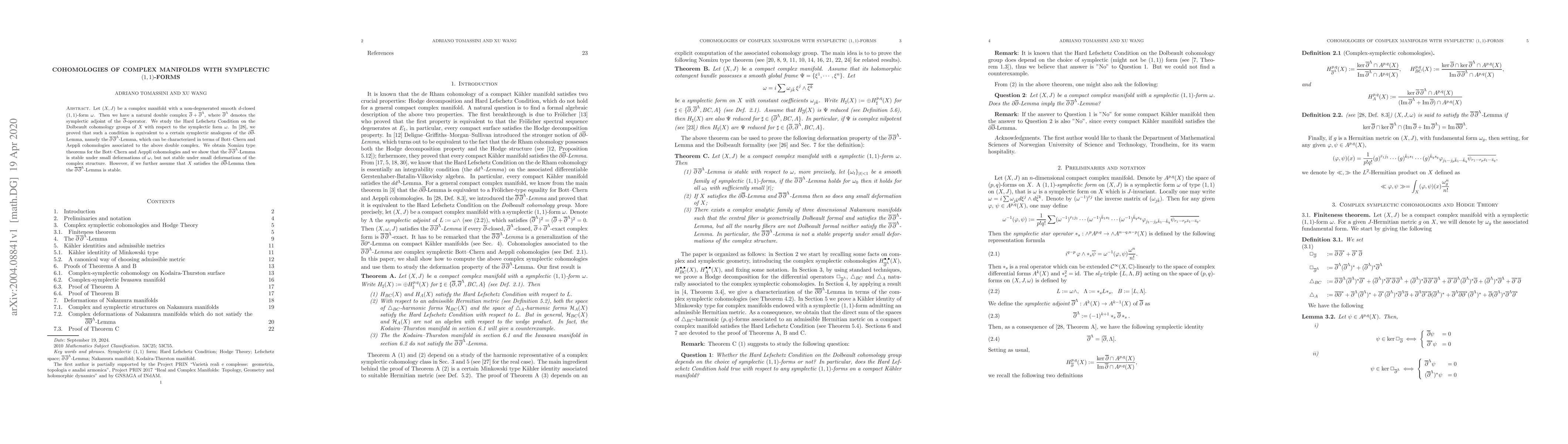 Let $(X, J)$ be a complex manifold with a non-degenerated smooth $d$-closed $(1,1)$-form $\omega$. Then we have a natural double complex $\overline{\partial}+\overline{\partial}^\Lambda$, where $\overline{\partial}^\Lambda$ denotes the symplectic adjoint of the $\overline{\partial}$-operator. We study the Hard Lefschetz Condition on the Dolbeault cohomology groups of $X$ with respect to the symplectic form $\omega$. In \cite{TW}, we proved that such a condition is equivalent to a certain symplectic analogous of the $\partial\overline{\partial}$-Lemma, namely the $\overline{\partial}\, \overline{\partial}^\Lambda$-Lemma, which can be characterized in terms of Bott--Chern and Aeppli cohomologies associated to the above double complex. We obtain Nomizu type theorems for the Bott--Chern and Aeppli cohomologies and we show that the $\overline{\partial}\, \overline{\partial}^\Lambda$-Lemma is stable under small deformations of $\omega$, but not stable under small deformations of the complex structure. However, if we further assume that $X$ satisfies the $\partial\overline{\partial}$-Lemma then the $\overline{\partial}\, \overline{\partial}^\Lambda$-Lemma is stable.