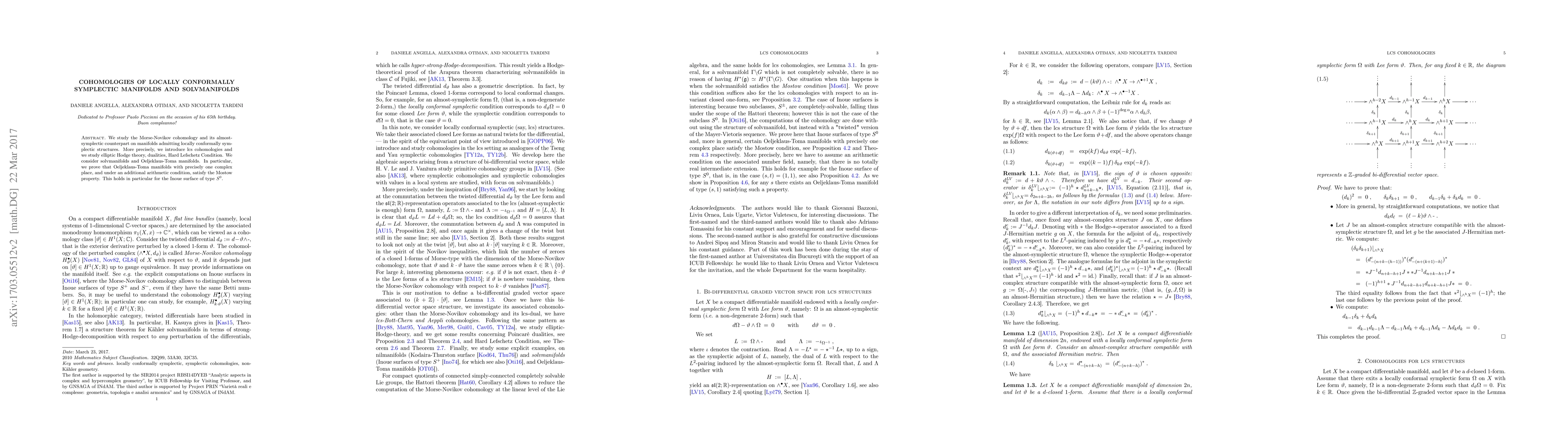 We study the Morse-Novikov cohomology and its almost-symplectic counterpart on manifolds admitting locally conformally symplectic structures. More precisely, we introduce lcs cohomologies and we study elliptic Hodge theory, dualities, Hard Lefschetz Condition. We consider solvmanifolds and Oeljeklaus-Toma manifolds. In particular, we prove that Oeljeklaus-Toma manifolds with precisely one complex place, and under an additional arithmetic condition, satisfy the Mostow property. This holds in particular for the Inoue surface of type $S^0$.