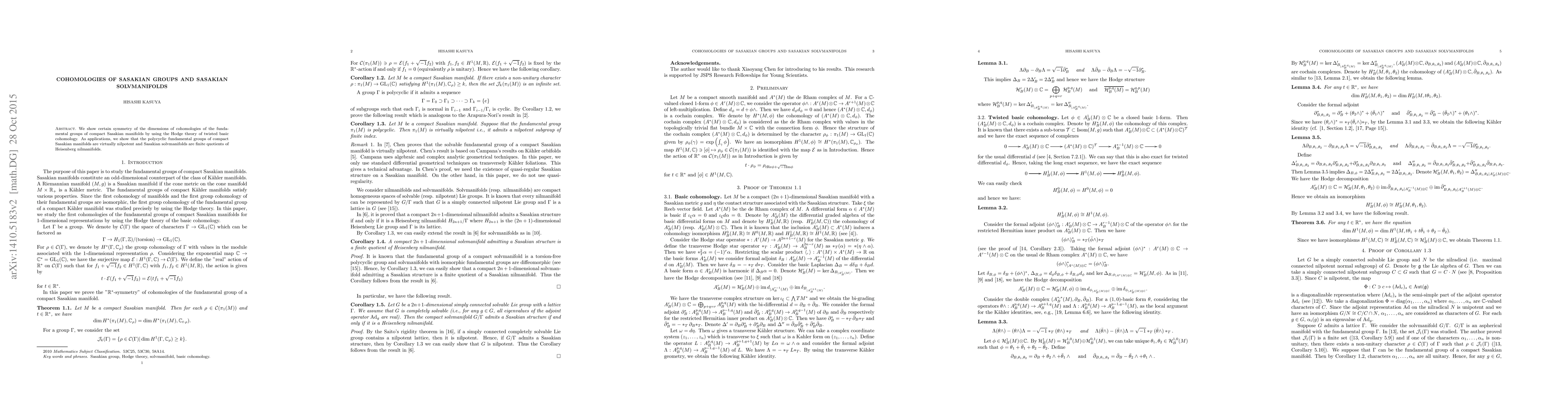 We show certain symmetry of the dimensions of cohomologies of the funda- mental groups of compact Sasakian manifolds by using the Hodge theory of twisted basic cohomology. As applications, we show that the polycyclic fundamental groups of compact Sasakian manifolds are virtually nilpotent and Sasakian solvmanifolds are finite quotients of Heisenberg nilmanifolds.