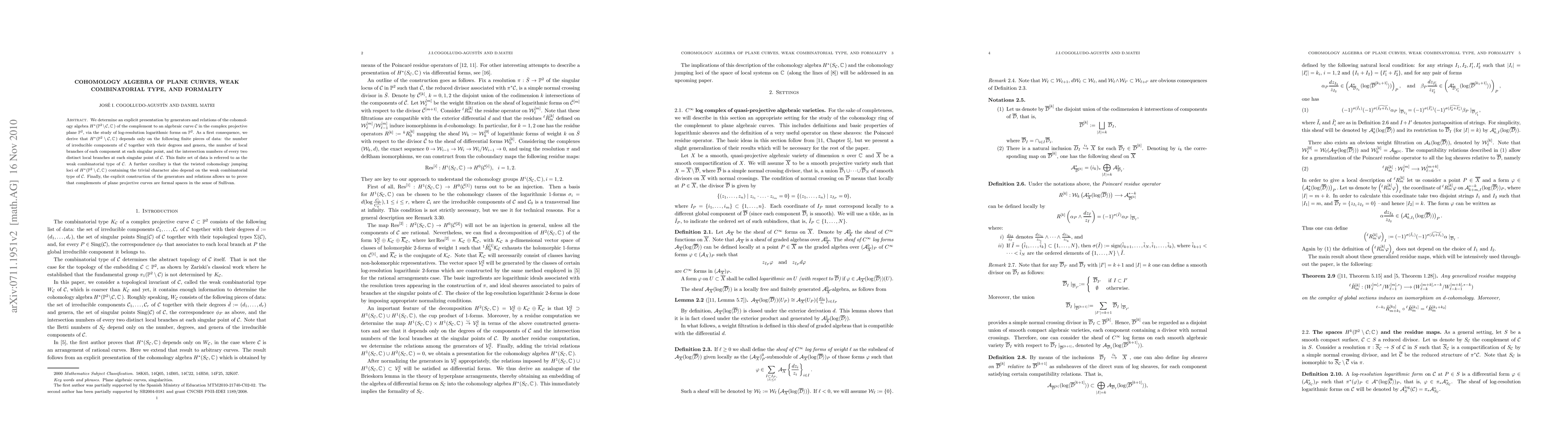 We determine an explicit presentation by generators and relations of the cohomology algebra $H^*(\mathbb P^2\setminus C,\mathbb C)$ of the complement to an algebraic curve $C$ in the complex projective plane $\mathbb P^2$, via the study of log-resolution logarithmic forms on $\mathbb P^2$. As a first consequence, we derive that $H^*(\mathbb P^2\setminus C,\mathbb C)$ depends only on the following finite pieces of data: the number of irreducible components of $C$ together with their degrees and genera, the number of local branches of each component at each singular point, and the intersection numbers of every two distinct local branches at each singular point of $C$. This finite set of data is referred to as the weak combinatorial type of $C$. A further corollary is that the twisted cohomology jumping loci of $H^*(\mathbb P^2\setminus C,\mathbb C)$ containing the trivial character also depend on the weak combinatorial type of $C$. Finally, the explicit construction of the generators and relations allows us to prove that complements of plane projective curves are formal spaces in the sense of Sullivan.