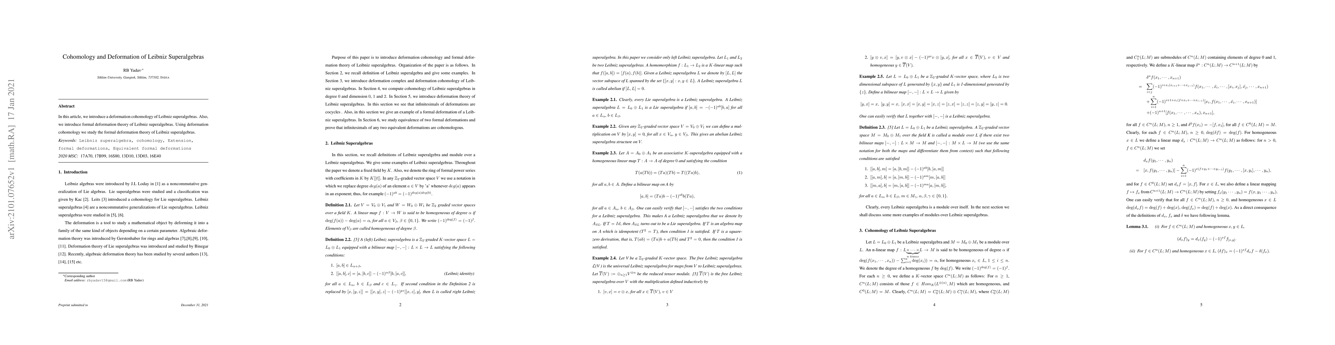 Summary: This paper introduces deformation cohomology for Leibniz superalgebras and develops a formal deformation theory. It utilizes deformation cohomology to investigate the formal deformations of Leibniz superalgebras.