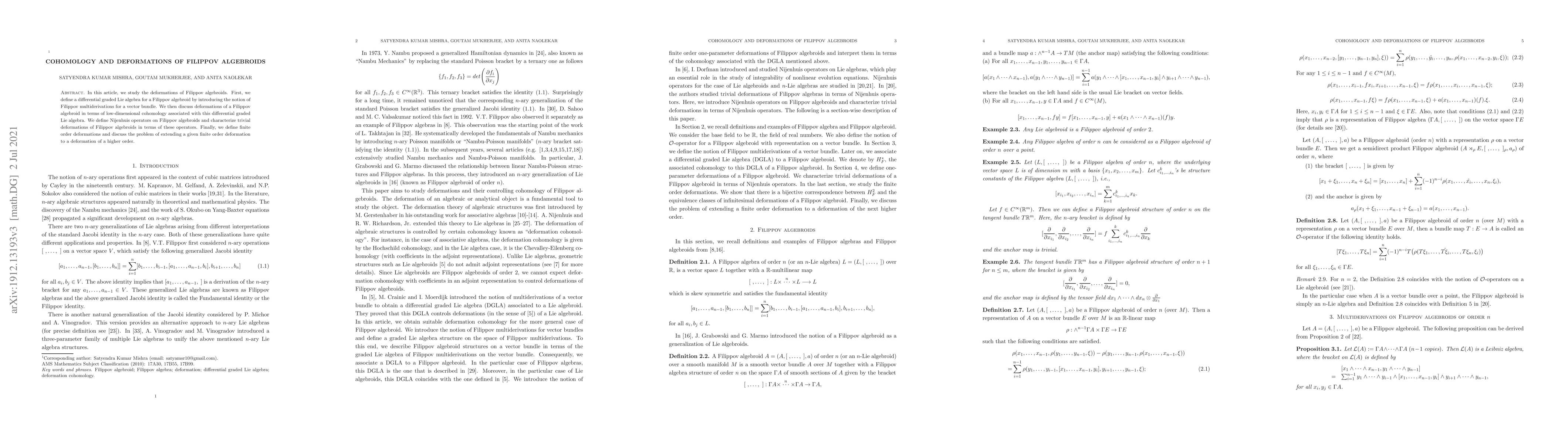 This paper studies the deformations of Filippov algebroids using differential graded Lie algebras and introduces Filippov multiderivations. It explores low-dimensional cohomology and Nijenhuis operators to characterize and extend these deformations, focusing on finite order deformations and their potential advancement to higher orders.