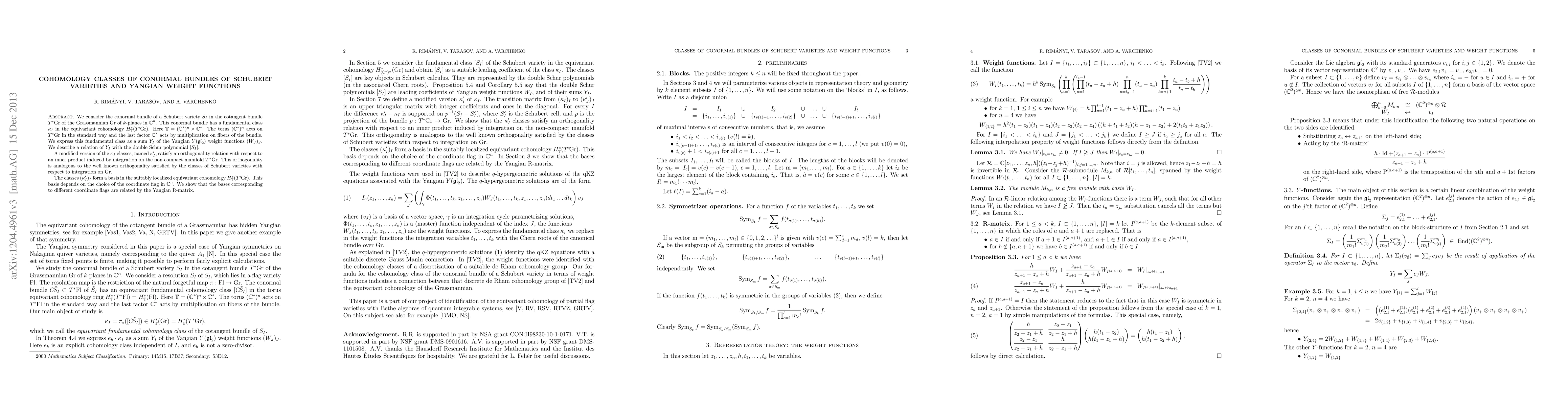 We consider the conormal bundle of a Schubert variety $S_I$ in the cotangent bundle $T^* Gr$ of the Grassmannian $Gr$ of $k$-planes in $C^n$. This conormal bundle has a fundamental class ${\kappa_I}$ in the equivariant cohomology $H^*_{T}(T^* Gr)$. Here $T=(C^*)^n\times C^*$. The torus $(C^*)^n$ acts on $T^* Gr$ in the standard way and the last factor $C^*$ acts by multiplication on fibers of the bundle. We express this fundamental class as a sum $Y_I$ of the Yangian $Y(gl_2)$ weight functions $(W_J)_J$. We describe a relation of $Y_I$ with the double Schur polynomial $[S_I]$. A modified version of the $\kappa_I$ classes, named $\kappa'_I$, satisfy an orthogonality relation with respect to an inner product induced by integration on the non-compact manifold $T^* Gr$. This orthogonality is analogous to the well known orthogonality satisfied by the classes of Schubert varieties with respect to integration on $Gr$. The classes $(\kappa'_I)_I$ form a basis in the suitably localized equivariant cohomology $H^*_{T}(T^* Gr)$. This basis depends on the choice of the coordinate flag in $C^n$. We show that the bases corresponding to different coordinate flags are related by the Yangian R-matrix.