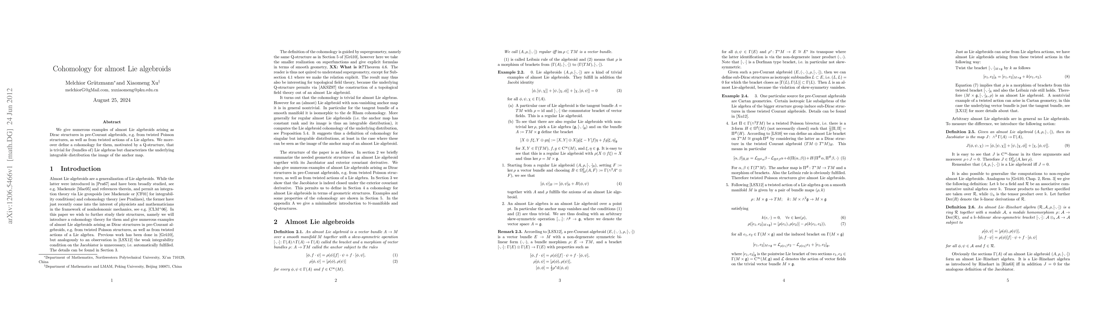 Summary: The paper explores examples of almost Lie algebroids derived from Dirac structures in pre-Courant algebroids, particularly from twisted Poisson structures and Lie algebra actions. It introduces a cohomology theory for these structures that is trivial for Lie algebras but captures the integrable distribution represented by their anchor maps.