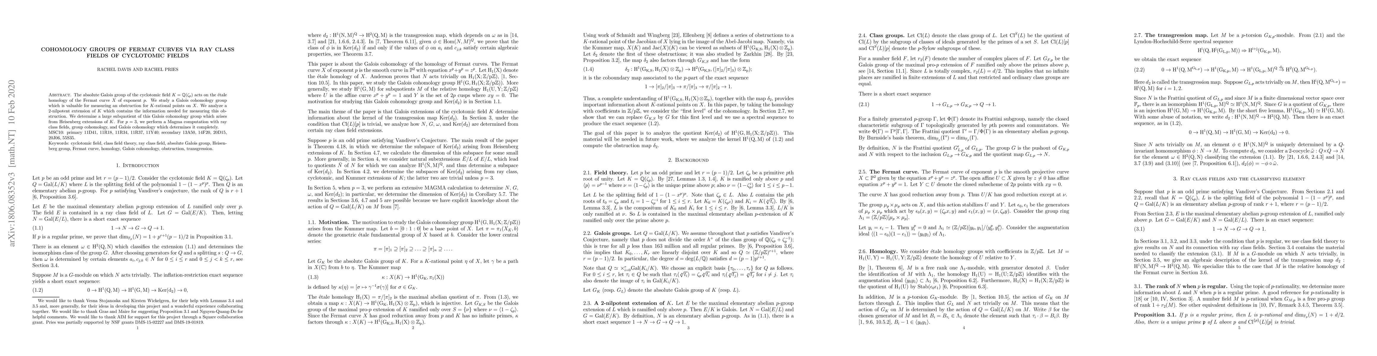 The absolute Galois group of the cyclotomic field $K={\mathbb Q}(\zeta_p)$ acts on the \'etale homology of the Fermat curve $X$ of exponent $p$. We study a Galois cohomology group which is valuable for measuring an obstruction for $K$-rational points on $X$. We analyze a $2$-nilpotent extension of $K$ which contains the information needed for measuring this obstruction. We determine a large subquotient of this Galois cohomology group which arises from Heisenberg extensions of $K$. For $p=3$, we perform a Magma computation with ray class fields, group cohomology, and Galois cohomology, which determines it completely.