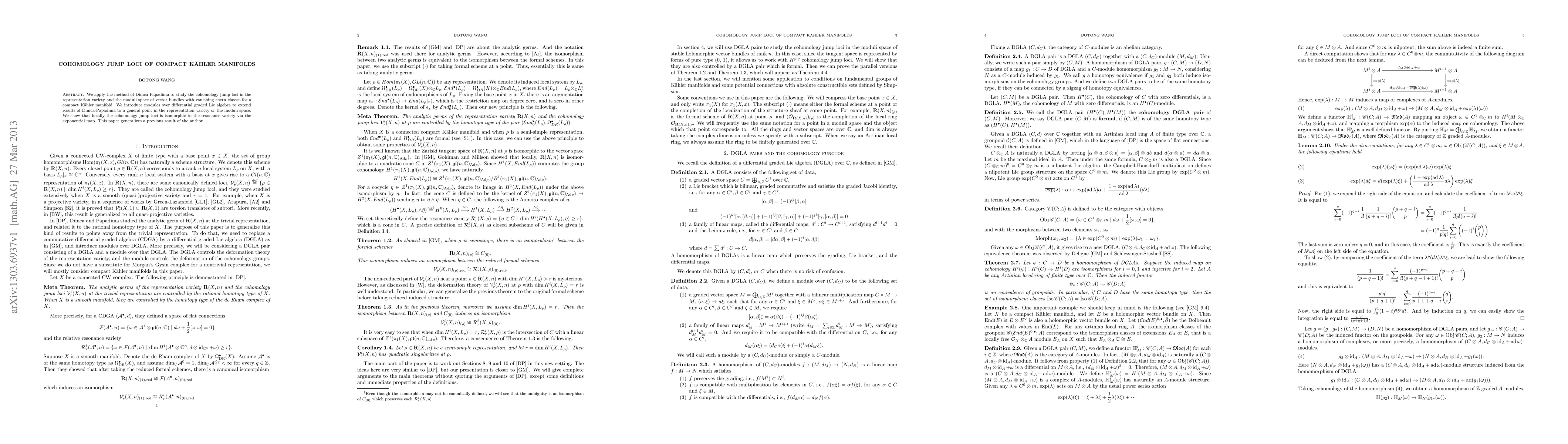 This paper extends Dimca-Papadima's method to analyze cohomology jump loci in the representation variety and moduli space of vector bundles for compact Kähler manifolds, utilizing modules over differential graded Lie algebras. It demonstrates local isomorphism between cohomology jump loci and the resonance variety via the exponential map.
