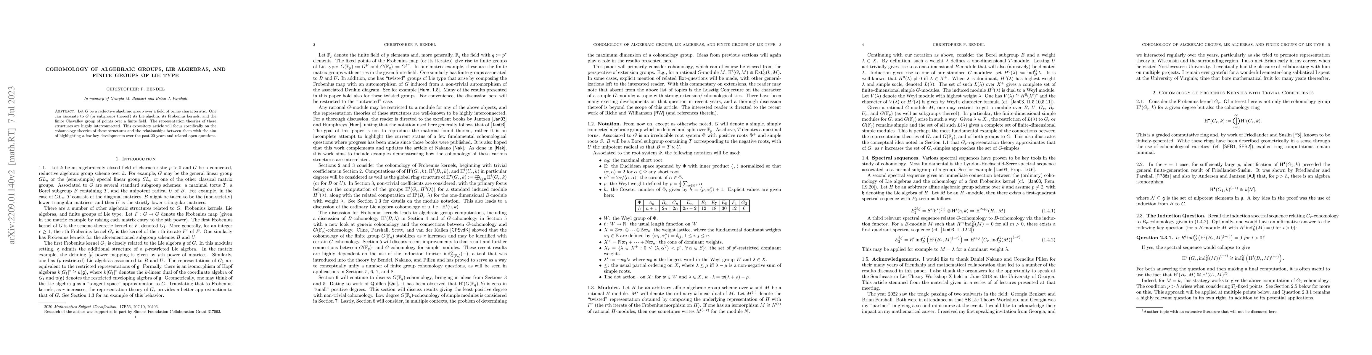 Let G be a reductive algebraic group over a field of prime characteristic. One can associate to G (or subgroups thereof) its Lie algebra, its Frobenius kernels, and the finite Chevalley group of points over a finite field. The representation theories of these structures are highly interconnected. This expository article will focus specifically on the cohomology theories of these structures and the relationships between them with the aim of highlighting a few key developments over the past 20 years and related open questions.