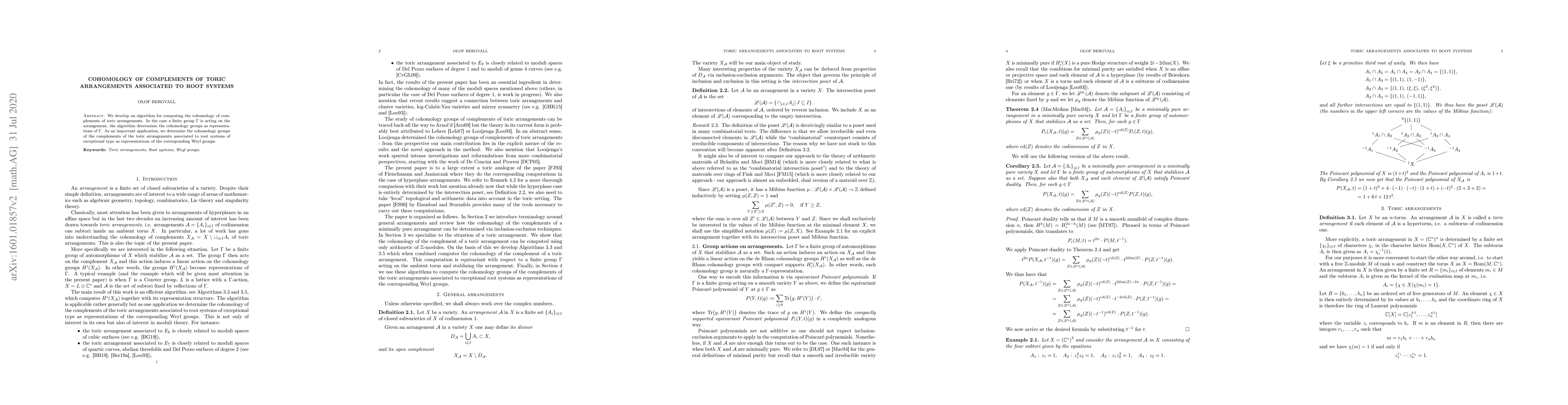This paper develops an algorithm to compute the cohomology of toric arrangements associated with root systems, specifically focusing on exceptional cases $G_2$, $F_4$, $E_6$, and $E_7$, and providing a formula for the Poincaré polynomial for $A_n$ arrangements.