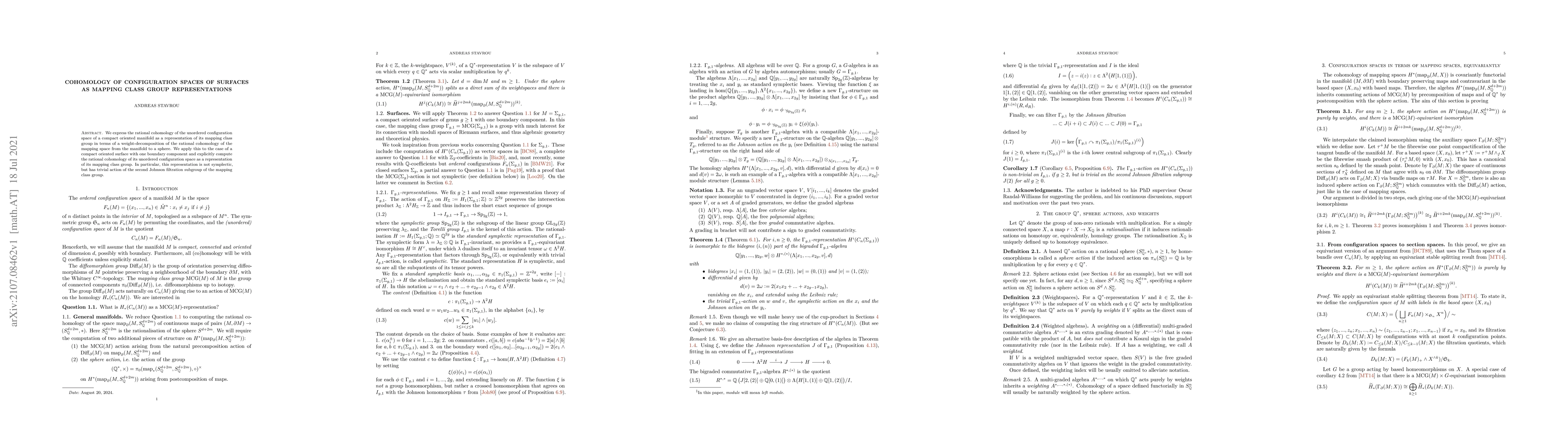 Researchers found that the cohomology of a surface's configuration space can be represented as a mapping class group action, leading to new insights into symplectic geometry and the behavior of the second Johnson filtration subgroup.