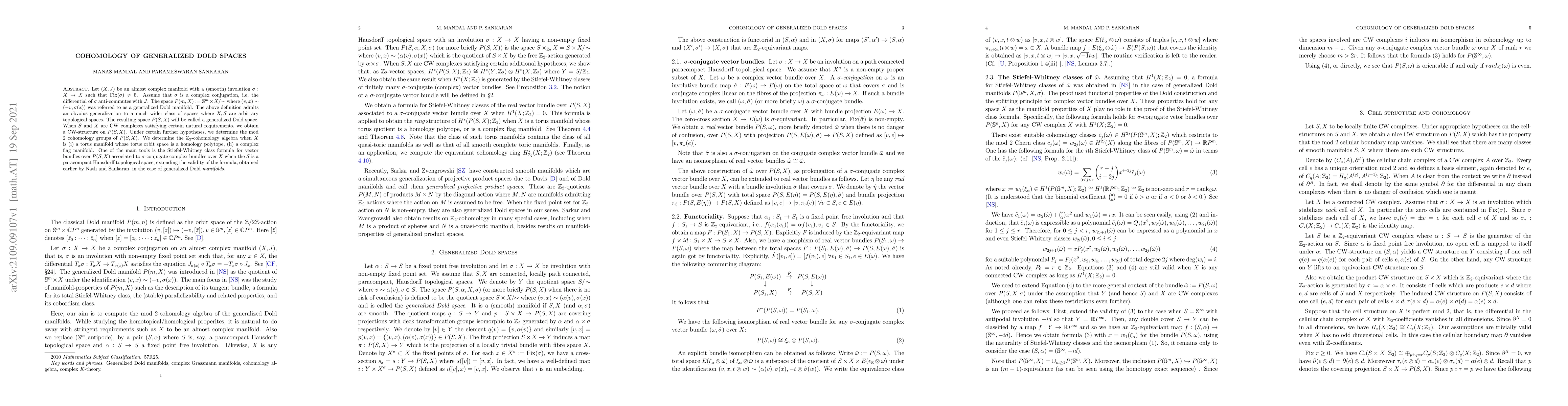 This paper explores the mod 2 cohomology of generalized Dold spaces, defined via an involution on almost complex manifolds, and establishes $\mathbb Z_2$-cohomology algebra results for specific cases such as torus manifolds and complex flag manifolds, utilizing Stiefel-Whitney class formulas for associated vector bundles.