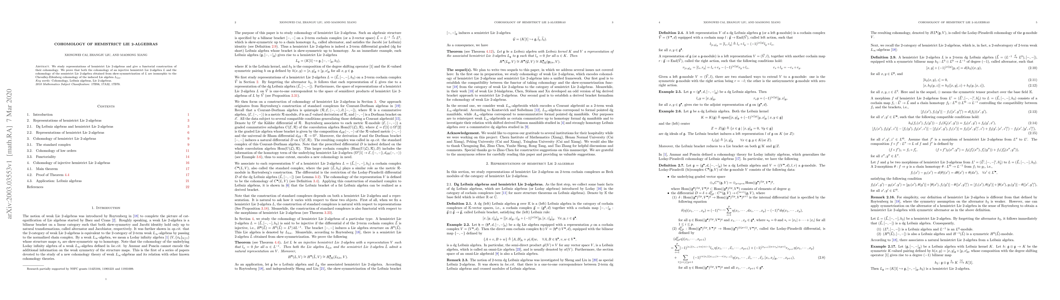We study representations of hemistrict Lie 2-algebras and give a functorial construction of their cohomology. We prove that both the cohomology of an injective hemistrict Lie 2-algebra $L$ and the cohomology of the semistrict Lie 2-algebra obtained from skew-symmetrization of $L$ are isomorphic to the Chevalley-Eilenberg cohomology of the induced Lie algebra $L_{\operatorname{Lie}}$.
