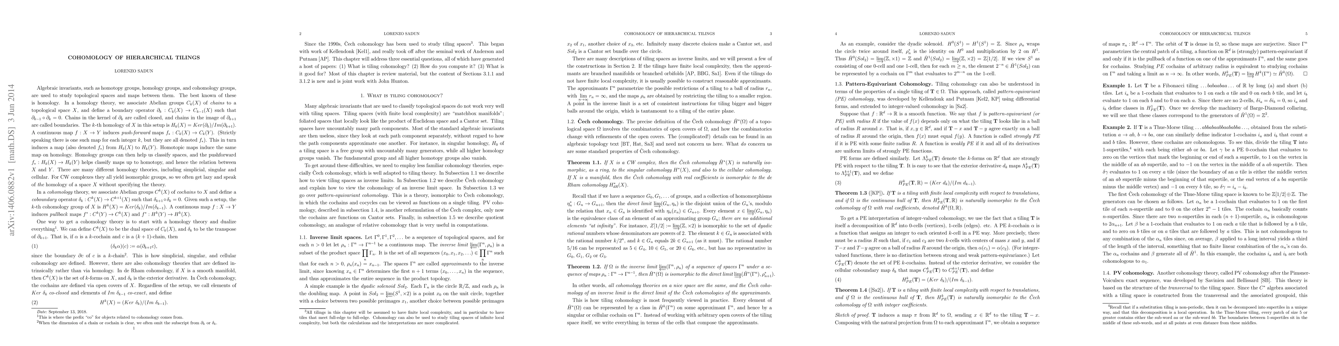 This paper explores various cohomology theories for hierarchical tilings, focusing on inverse limit constructions and their applications in distinguishing spaces, understanding deformations, and mapping between tiling spaces. The study emphasizes substitution tilings but extends to cut-and-project and local matching rule tilings.