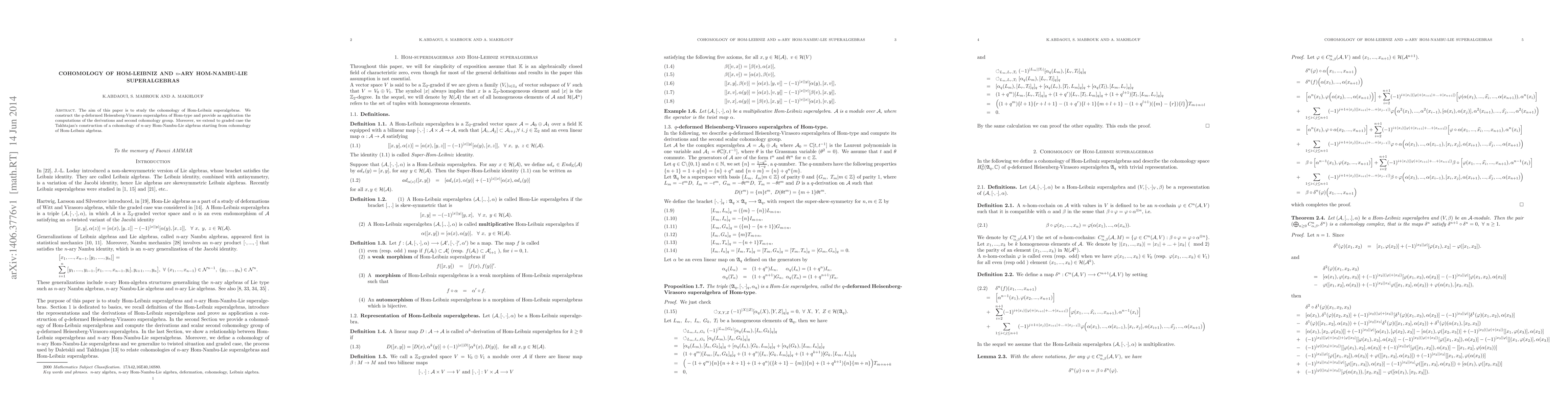 This paper investigates the cohomology of Hom-Leibniz superalgebras, introducing a $q$-deformed Heisenberg-Virasoro superalgebra of Hom-type and calculating derivations and the second cohomology group. It also extends Takhtajan's cohomology construction for $n$-ary Hom-Nambu-Lie algebras from Hom-Leibniz algebras.