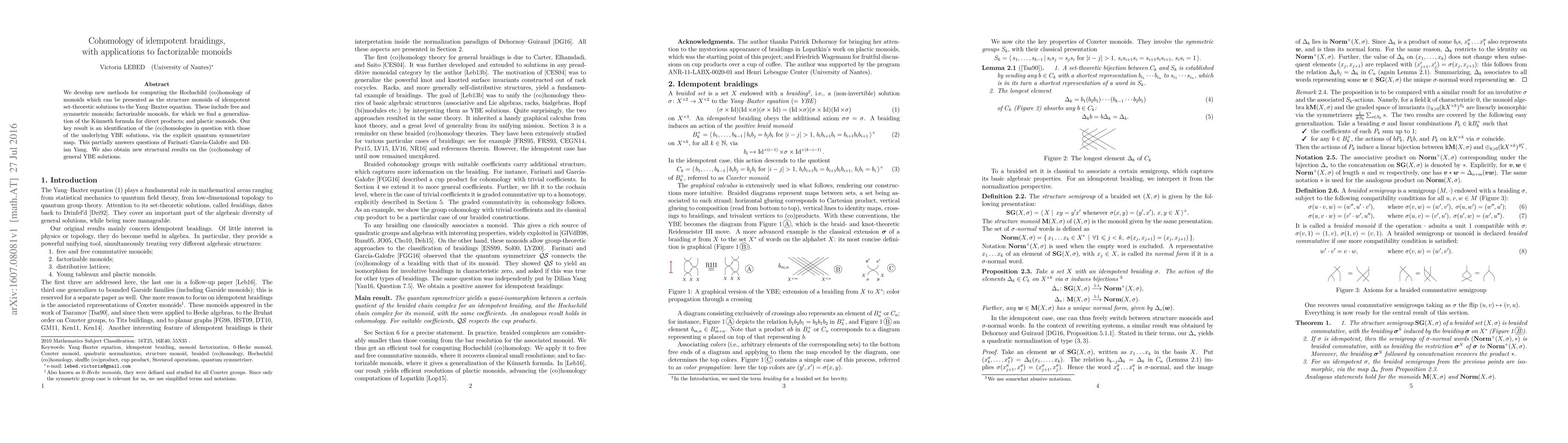 We develop new methods for computing the Hochschild (co)homology of monoids which can be presented as the structure monoids of idempotent set-theoretic solutions to the Yang--Baxter equation. These include free and symmetric monoids; factorizable monoids, for which we find a generalization of the K{\"u}nneth formula for direct products; and plactic monoids. Our key result is an identification of the (co)homologies in question with those of the underlying YBE solutions, via the explicit quantum symmetrizer map. This partially answers questions of Farinati--Garc{\'i}a-Galofre and Dilian Yang. We also obtain new structural results on the (co)homology of general YBE solutions.
