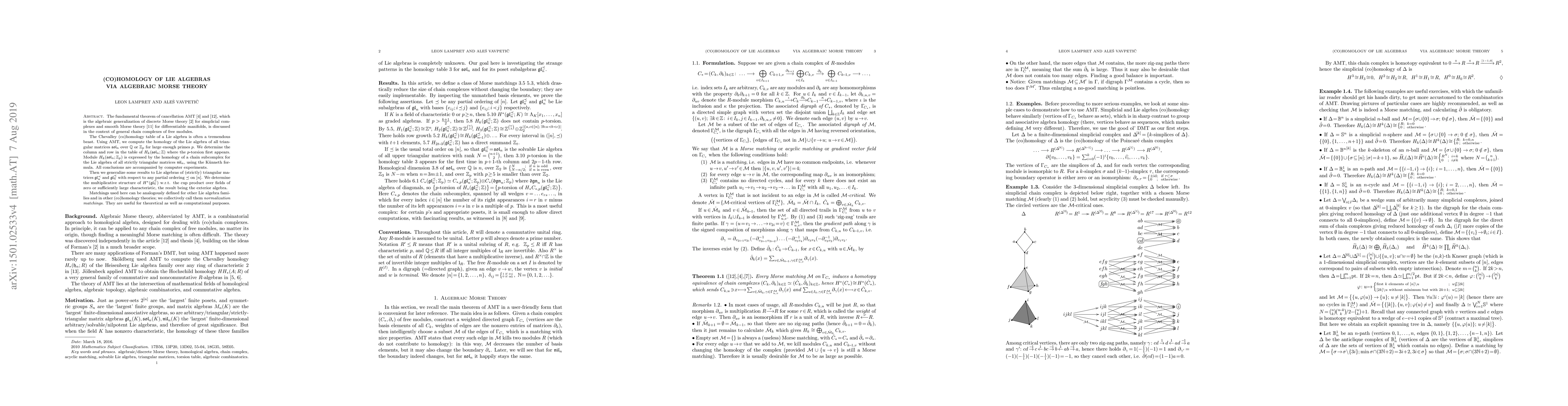 E. Sk\"oldberg's Morse Theory from an Algebraic Viewpoint and M. J\"ollenbeck's Algebraic Discrete Morse Theory and Applications to Commutative Algebra, which is the algebraic generalization of R. Forman's discrete Morse Theory for Cell Complexes, is discussed in the context of general chain complexes of free modules. Using this, we compute the Chevalley-Eilenberg (co)homology of the Lie algebra of all triangular matrices $\frak{sol}_n$ over $\mathbb{Q}$ or $\mathbb{Z}_p$ for large enough prime $p$. We determine the column and row in the table of $H_k(\frak{sol}_n;\mathbb{Z})$ where the $p$-torsion first appears. Every $\mathbb{Z}_{p^k}$ appears as a direct summand of some $H_k(\frak{sol}_n;\mathbb{Z})$. Module $H_k(\frak{sol}_n;\mathbb{Z}_p)$ is expressed by the homology of a chain subcomplex for the Lie algebra of all strictly triangular matrices $\frak{nil}_n$, using the K\"unneth formula. All conclusions are accompanied by computer experiments. Then we generalize some results to the more general Lie algebras of (strictly) triangular matrices $\frak{gl}_n^\prec$ and $\frak{gl}_n^\preceq$ with respect to any partial ordering $\preceq$ on $[n]$. Furthermore, the matchings used can be analogously defined for other Lie algebra families and are useful for theoretical as well as computational purposes.